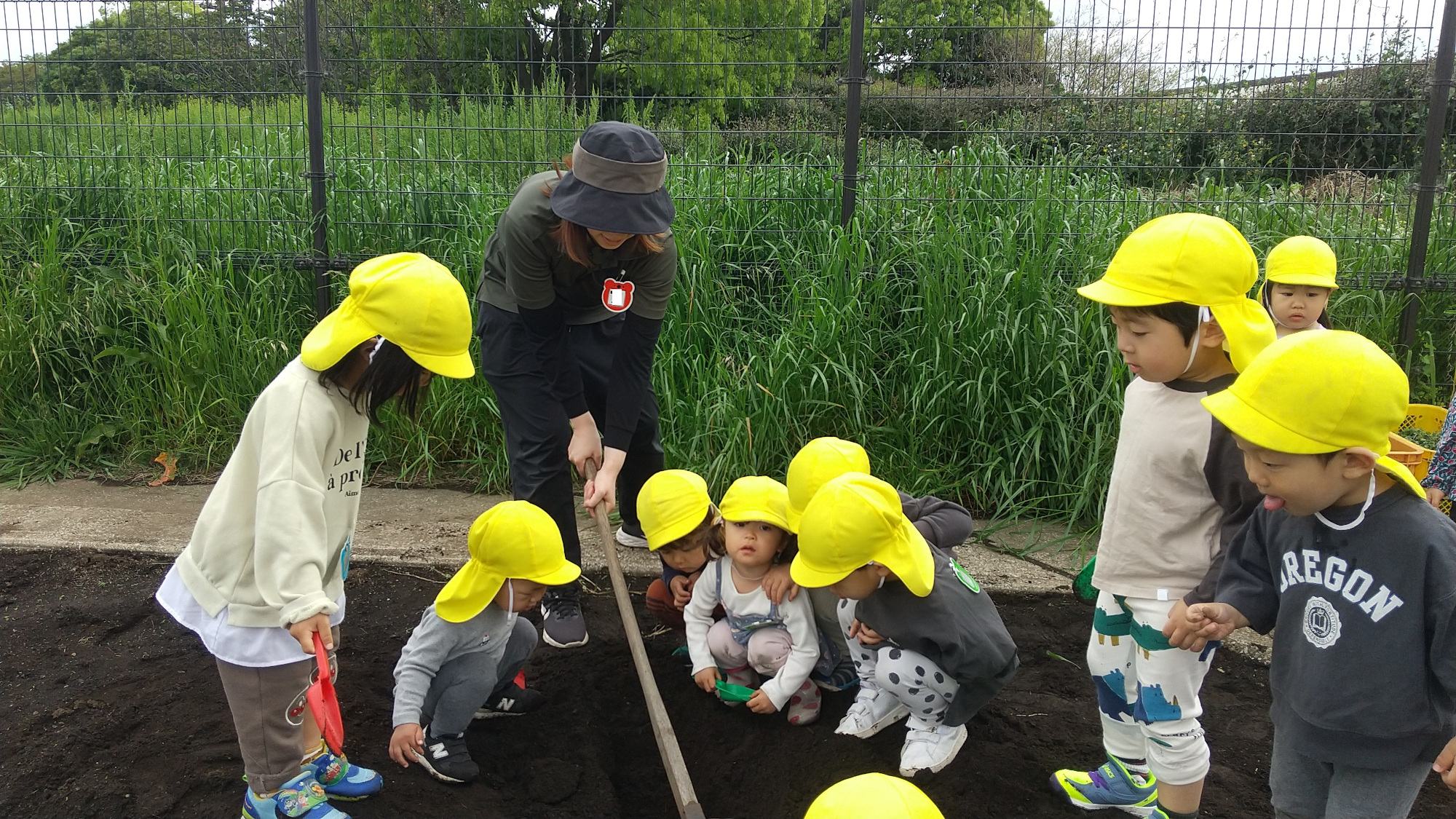 最後は、畑仕事に取り組む2、3歳児です。野菜を育てるためのベッド、畝を作っています。まずは、保育者が。次に、スコップを使って子どもたちが挑戦しています。土に触れてみたり、幼虫を探したりする姿もありました。畑仕事を通し、どのような学びや喜びがあるのか、これからの子どもたちの姿が楽しみです。
