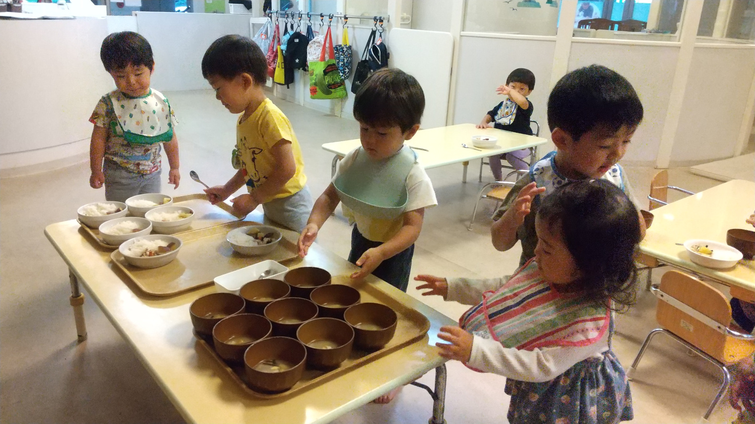 この写真は、あらかじめ盛り付けられた食事を慎重に運んでいる子どもたちの姿ですが、新年度が始まり3月が経った今では、自分で、難しい時にはできる人に手伝ってもらいながら、バイキング形式で食事をよそって食べています。