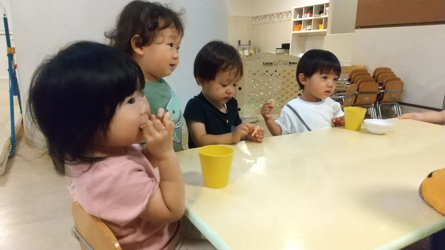 最後は、おやつを頬張る子どもたちです。この日のメニューは、クラッカーの夏みかんジャム添えでした。
