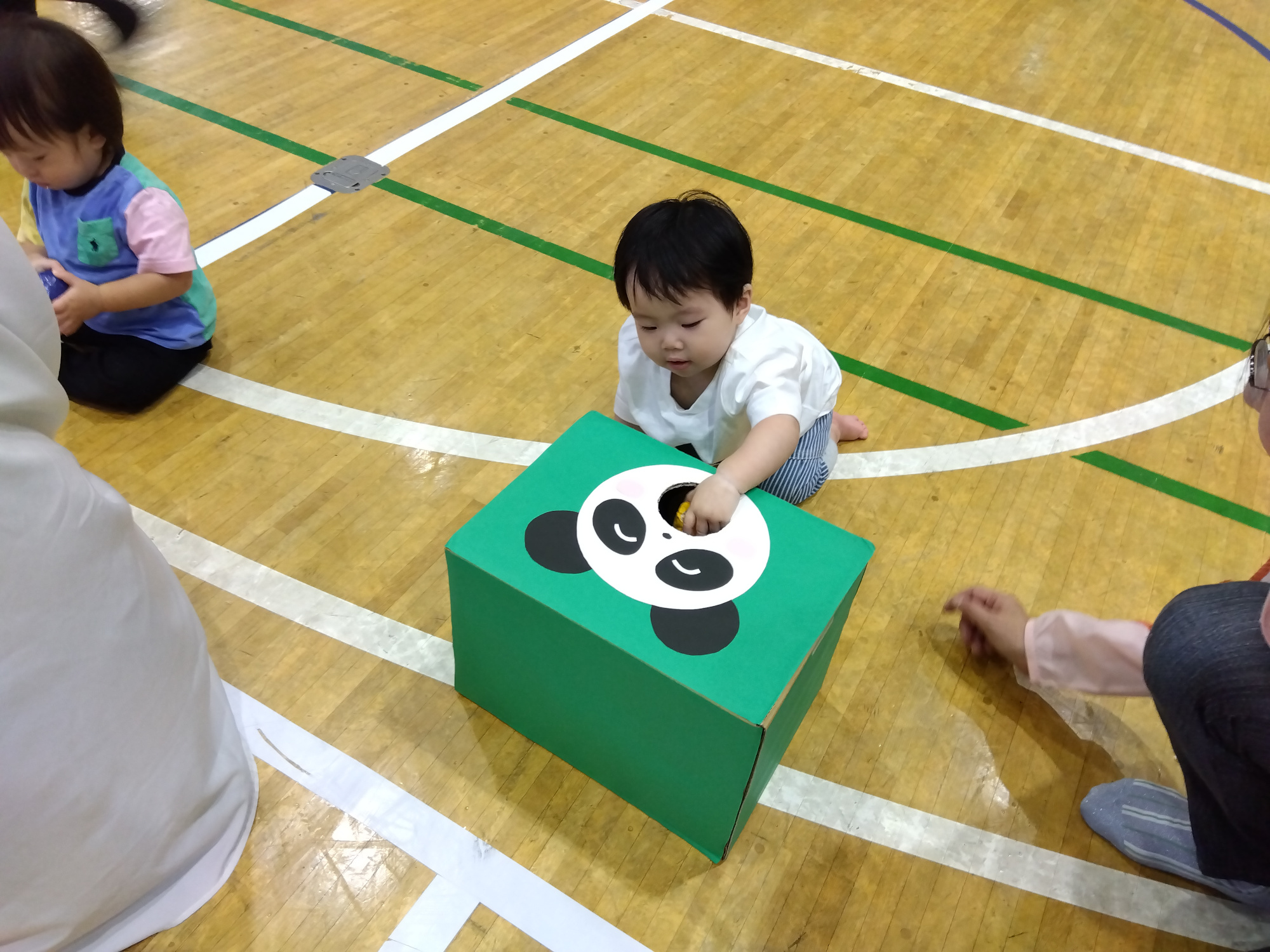 3、4歳児は、文字や標識に興味をもつ姿が見られ始めていることから、会場内に隠されている文字や標識を探し出すという競技を行ないました。友達と力を合わせて、ミッションをクリアしていました。