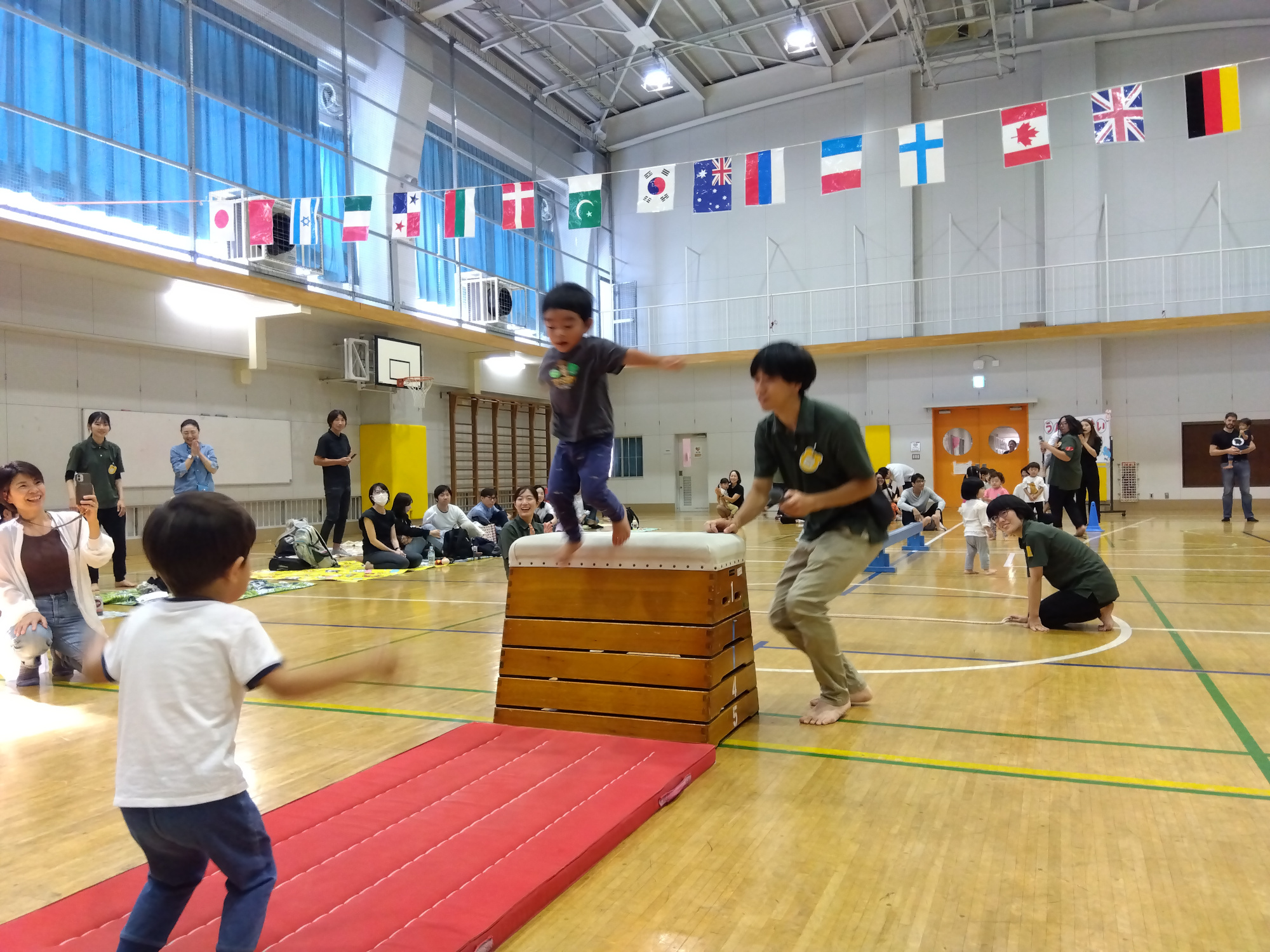 1、2歳児は、跳び箱や平均台などを取り込んだ障害物走にチャレンジしました。慣れない場所や雰囲気に緊張を見せる子どもの姿もありました。勇気を振り絞り、自分の力で、難しいものは保護者の方に支えられ、そして友達や保育者に見守られながら、競技に立ち向かっていました。