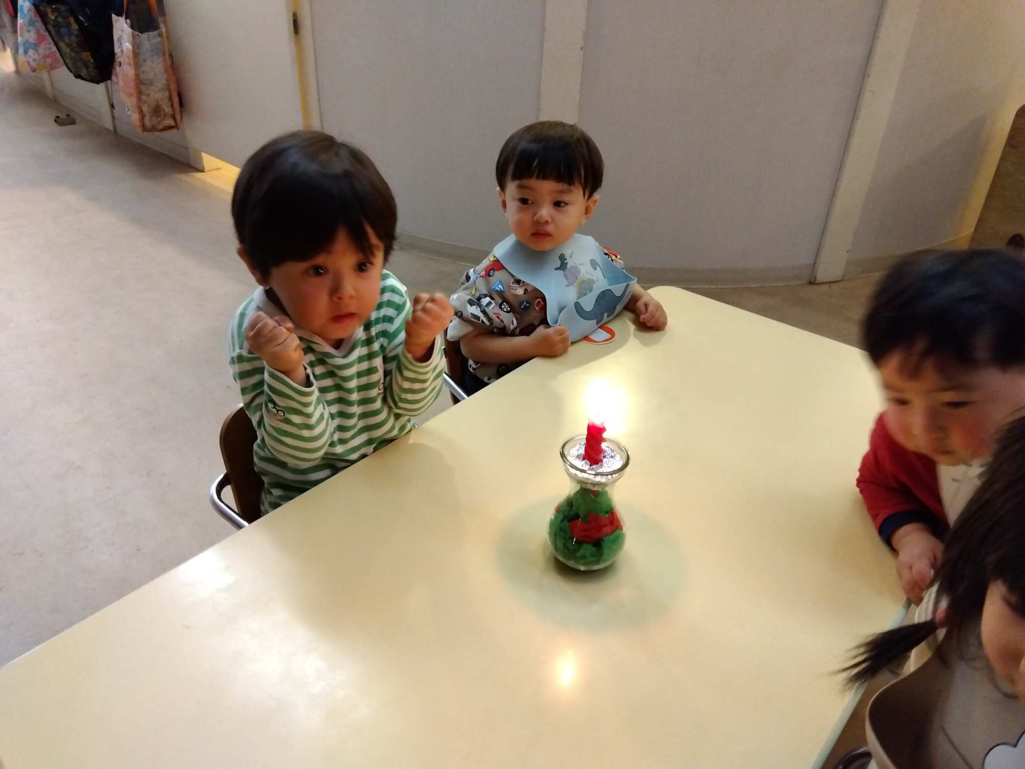 部屋の灯りをしぼり、キャンドルを焚くと、いつもとは違う雰囲気にワクワクとした様子の子どもたち。炎の揺らめきにうっとりとする子ども、気分が高揚している様子の子ども、「さわっちゃだめだよ…!」と友達や年下児に火の扱い方を知らせる子どもの姿がありました。