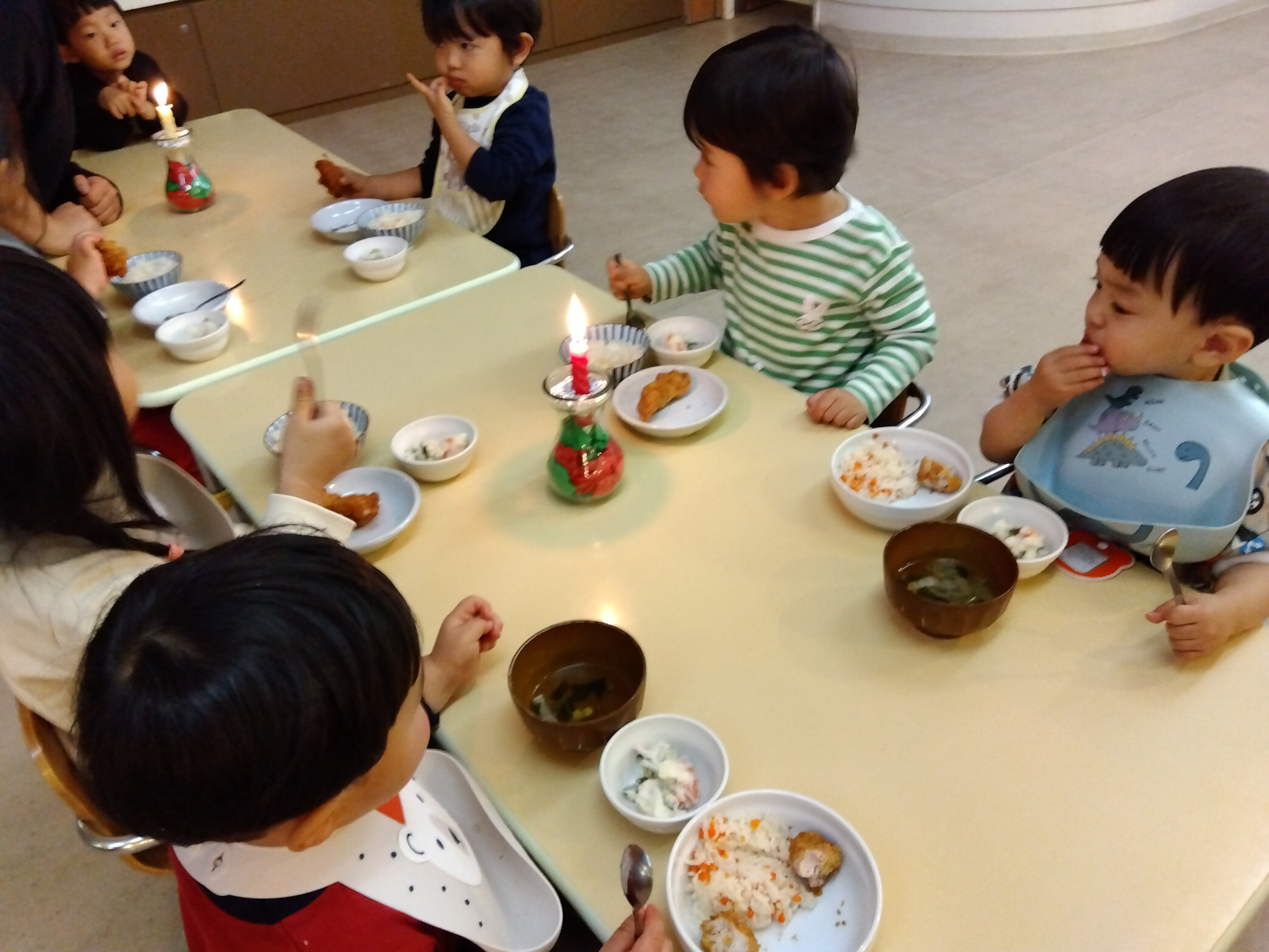 今年のクリスマスメニューは、キャロットライス、クリスピーチキン、ポテトサラダ、コンソメスープでした。キャンドルを囲み、クリスマスソングを流しながらの食事。近くに座る友達や保育者とお話ししながら、音楽のリズムに乗りながら。みんなで食べて、心もお腹も満たされました。