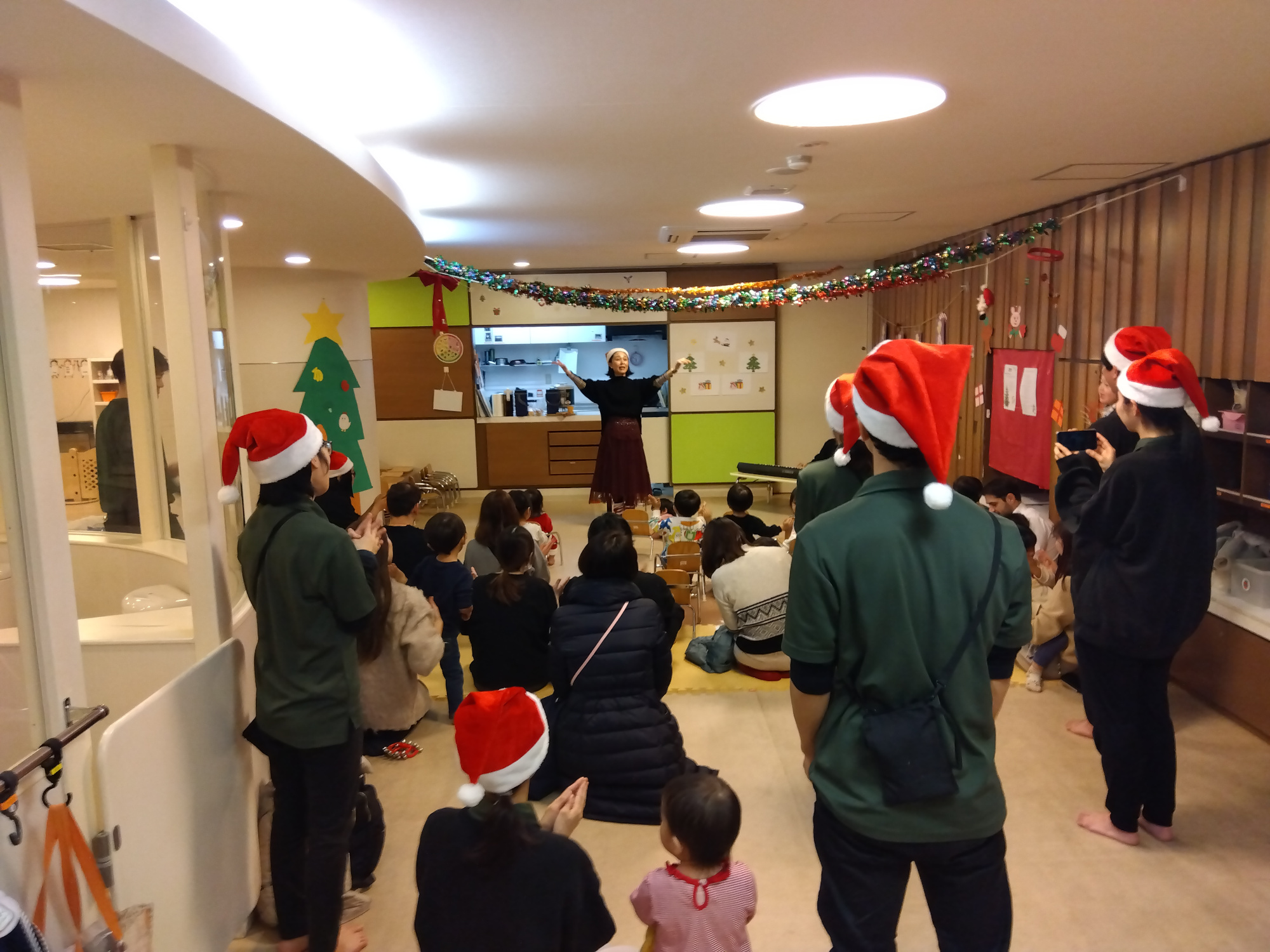 夕方の時間には、クリスマスコンサートを開催しました。コンサートの依頼は、在園児の保護者様へ。数々のミュージカルに出演経験のある方で、快く引き受けてくださいました。『ジングルベル』や『あわてんぼうのサンタクロース』『サンタが街にやってくる』といったクリスマスソング、「リトル・マーメイド」の挿入歌である『パート・オブ・ユア・ワールド』、『きらきらぼし』や『幸せなら手をたたこう』など日頃から子どもたちが歌い親しんでいる楽曲までをも、素敵な歌声と演出で届けてくださいました。真剣な眼差しで聴き入る子どもたち。パフォーマンスしているのは、仲の良い友達のお母さん。身近な大人が輝く姿に、憧れを抱いた子どももいるのではないかと思います。