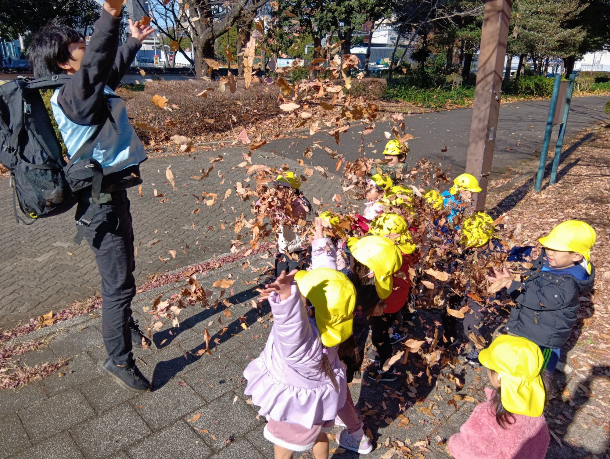 冬の時期のお楽しみの一つである、パリパリとした感触の落ち葉。ちぎって感触を確かめる姿もあれば、落ち葉シャワーを楽しむ姿も見られます。落ち葉は身近な自然であるため、季節の移ろいを感じられますね。