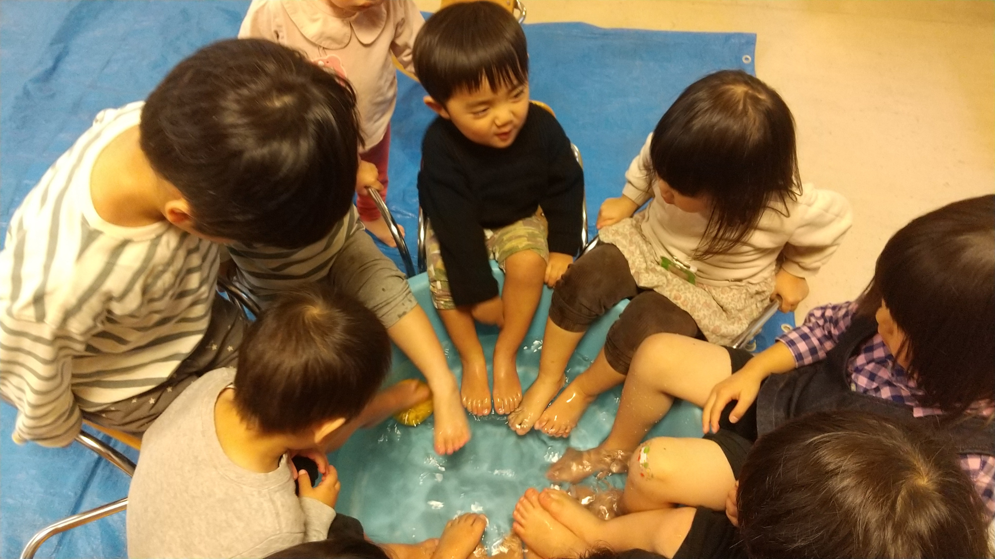 広場で見つけた柑橘系の果実をお湯に浮かべ、足湯を楽しんでいます。いい香りがするこの果実を園に持って帰りたいという子どもの声。足湯をしてみようという職員のアイデア。子どもの好奇心と職員の遊び心を掛け合わせ、わくわくする遊びを展開しています。