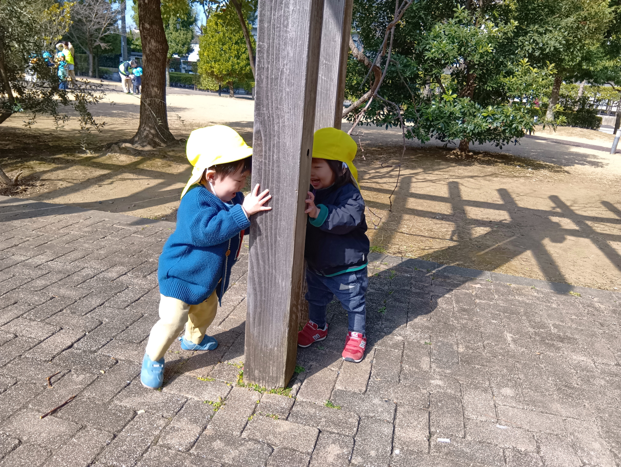 保育者との絆を拠り所にし、少しずつ人間関係の土台を育んできた子どもたち。0歳児では、同じクラスの友達に親しみを感じるようになったり、保育者の仲立ちのもと一緒に遊ぶことを楽しんだりする姿が見られるようになりました。最近の流行りの遊びはかくれんぼ。「ばぁ!」と言ったり、友達と笑い合ったりする姿が微笑ましいです。