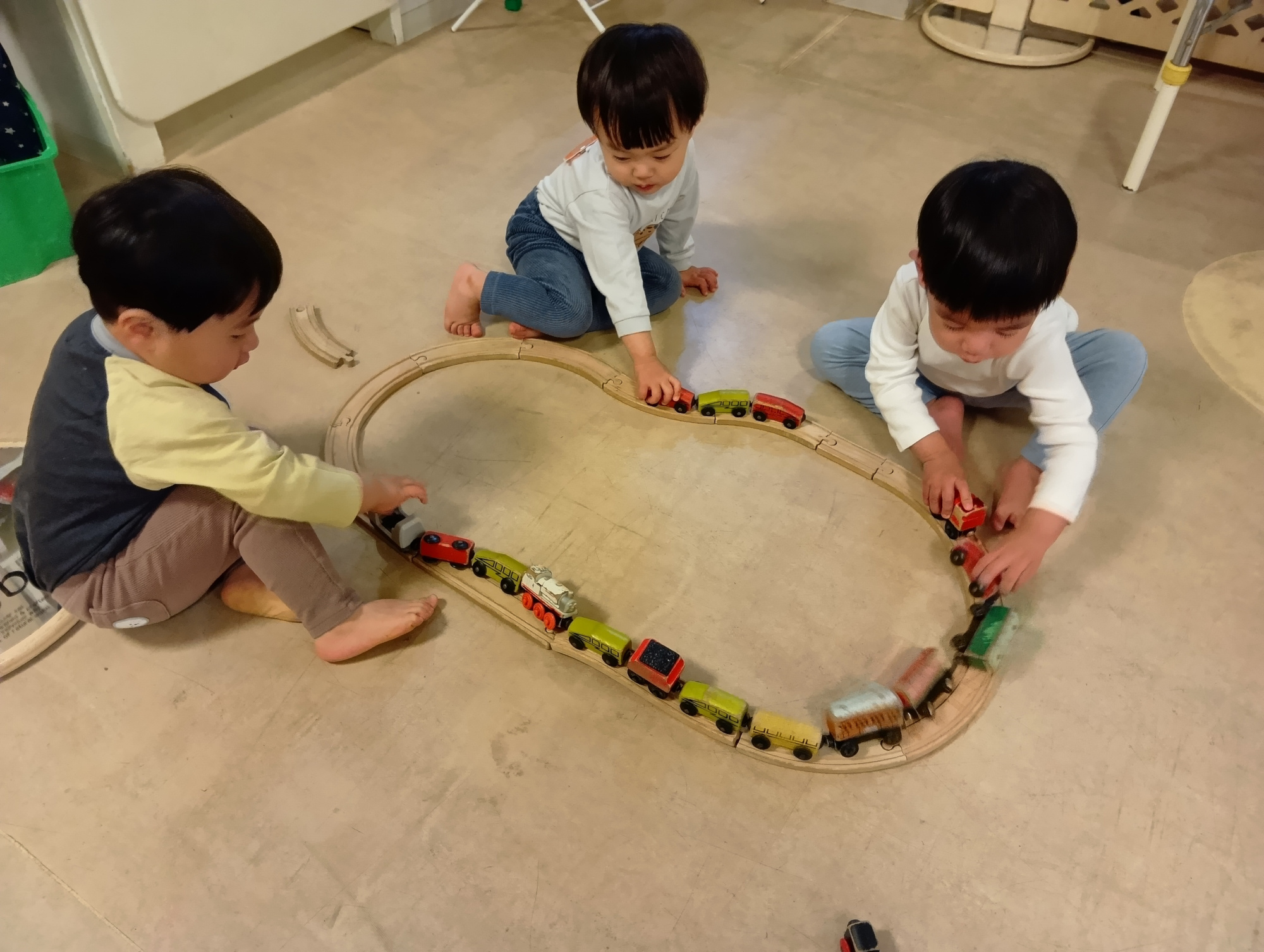 1歳児では、気の合う友達ができたり、物の貸し借りや順番を待つといったことが少しずつできるようになってきたりしている姿が見られます。友達の名前を呼びながら一緒に遊ぶ姿は、傍で見守る保育者の心を温かくしてくれています。