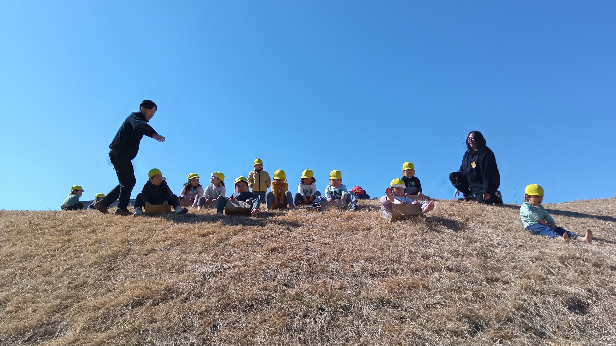 2~4歳児では、友達との関わりを通し、互いの思いや考えなどを共有したり、共通の目的をもって遊びを楽しんだりする姿が見られるようになりました。青空の下、「よーい、どん!」の合図で芝を滑り始める子どもたち。友達と一緒に過ごす時間を味わっています。