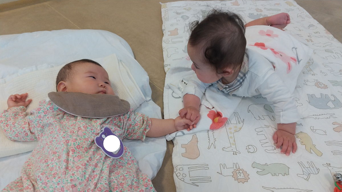 友だちの手に触れる0歳児