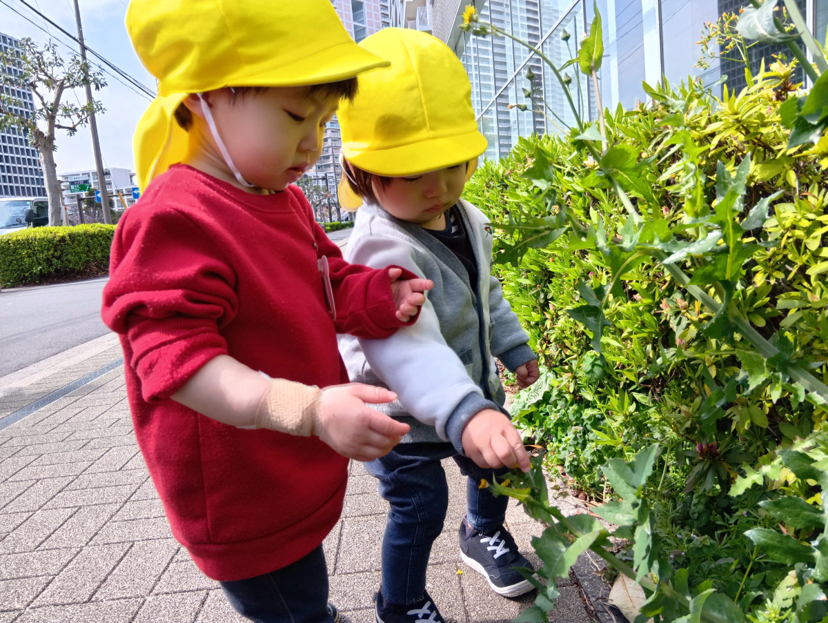 続いて1歳児の散歩の様子です。いつもの散歩道の景色が移り変わり、春を感じながら楽しんで歩いていました。道端に咲いているタンポポを見つけて摘んでみたり、隣にある綿毛を「ふーっ!」と飛ばしてみたりしていましたよ。なかなか飛ばない綿毛を口に近づけすぎてしまい、口元に綿毛を付けている姿がとても可愛らしかったです。
