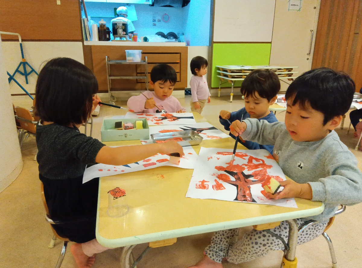続いては、2~5歳児の制作活動です。1つ目の制作では、木の枝が書かれている紙に絵の具で花を描きました。スポンジのスタンプや筆を使って散歩などで見かける桜の木をイメージしながら楽しく描いていました。自分の好きな色も混ぜながら個性のある素敵な桜を保育園にたくさん咲かせることができましたよ。