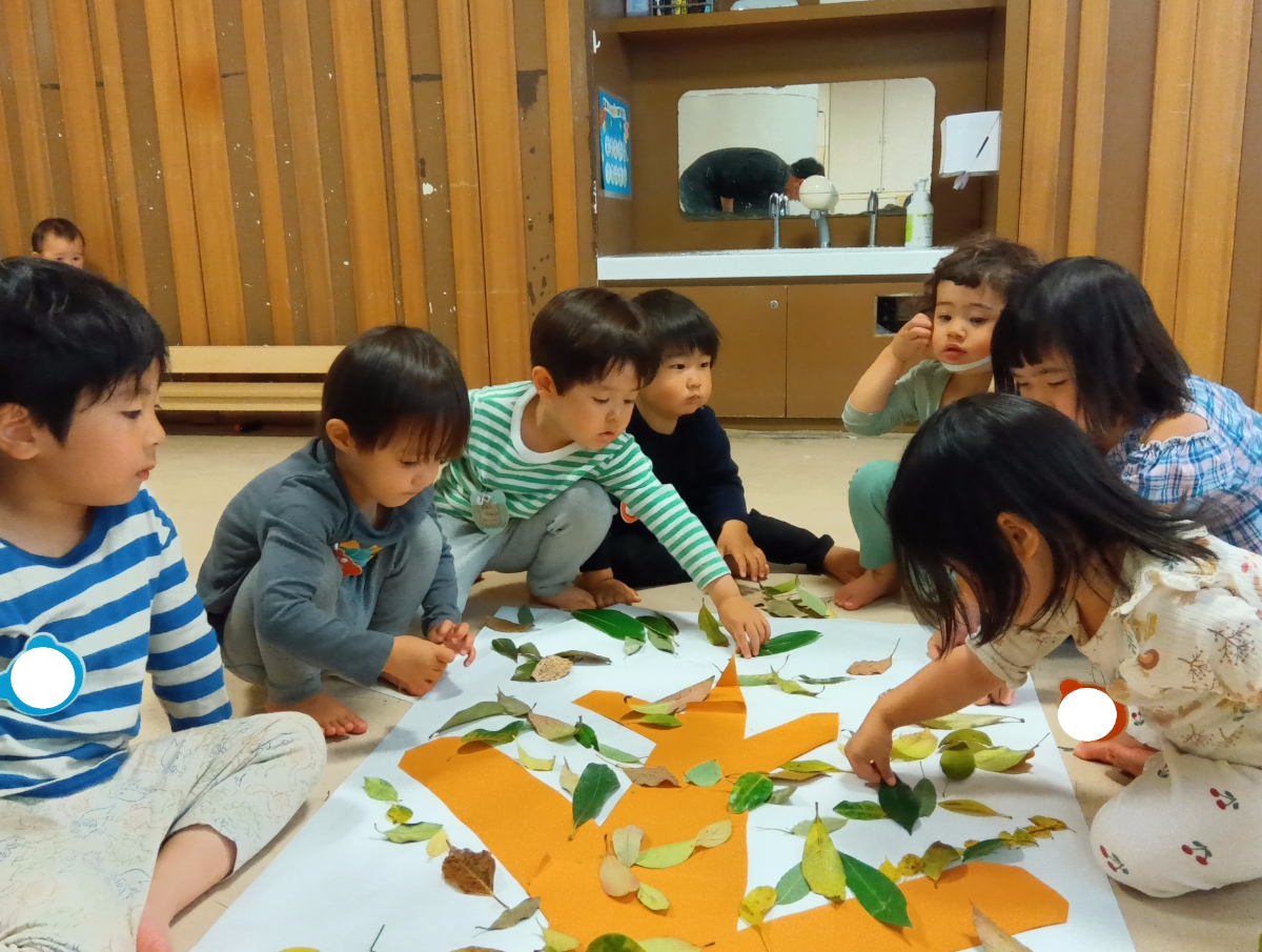 2つ目の制作では、散歩で集めた草花を使って一本の木を作りました。葉っぱや花を公園に探しに行くと、「この色きれい!」と自分の好きな色の葉っぱを集めたり、「これもかわいいから貼りたい!」と桜の花びらを集めたりして楽しんでいました。保育園で拾ってきた草花を模造紙に貼っていく際には、「ここにはこれ貼ろうよ!」「こっちもまだ貼れるんじゃない?」と子どもたちで相談しながら制作を楽しんでいましたよ。