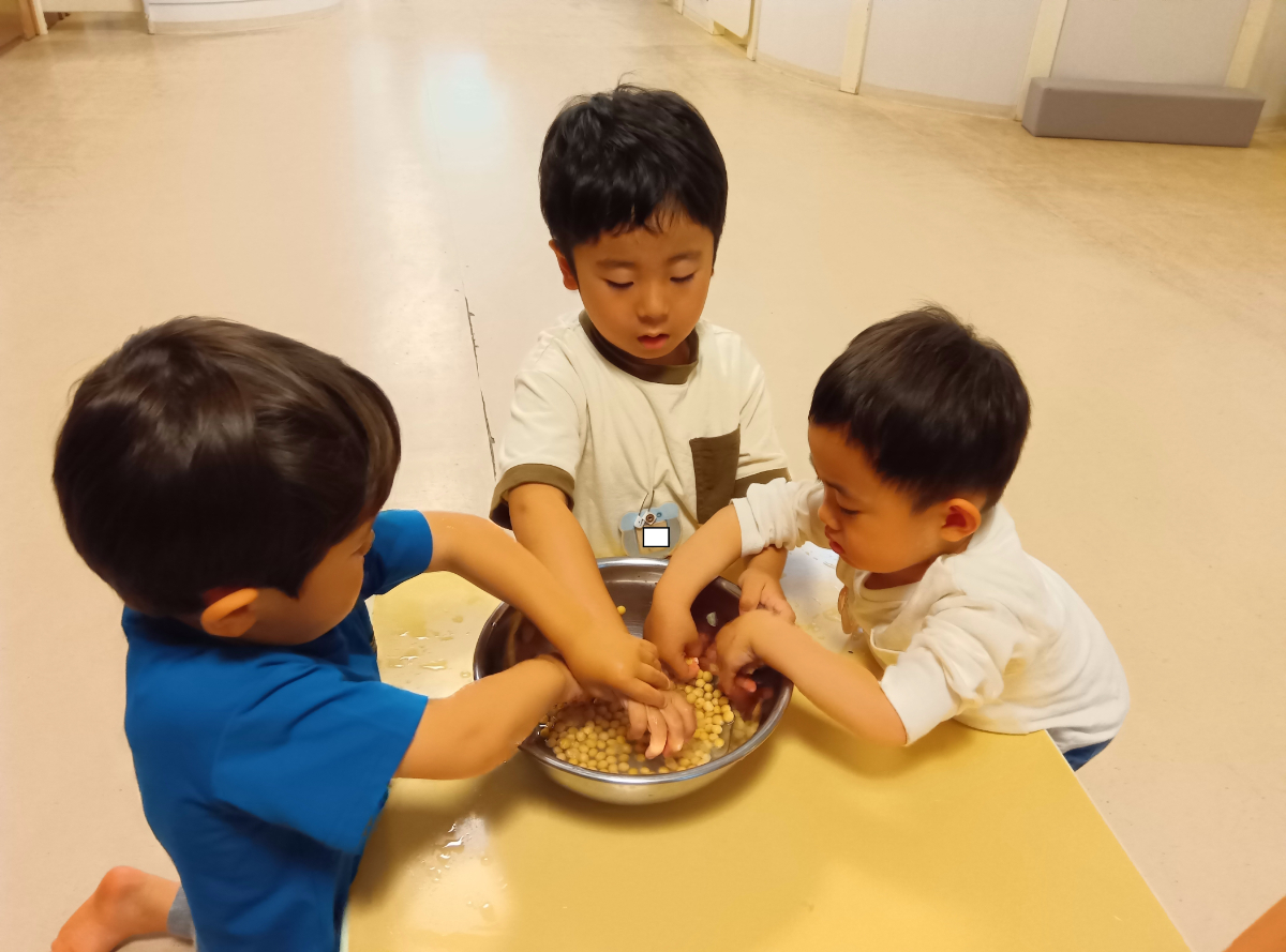 まずは5月の食育活動です。5月は、みそ作りを行いました。大豆の観察に始まり、コトコトじっくり煮詰めたり、潰したりといった作業に取り組みました。手作りみその出来上がりは12月。「なんかいねたらかんせいー?」と、心待ちにしている子どもたちです。