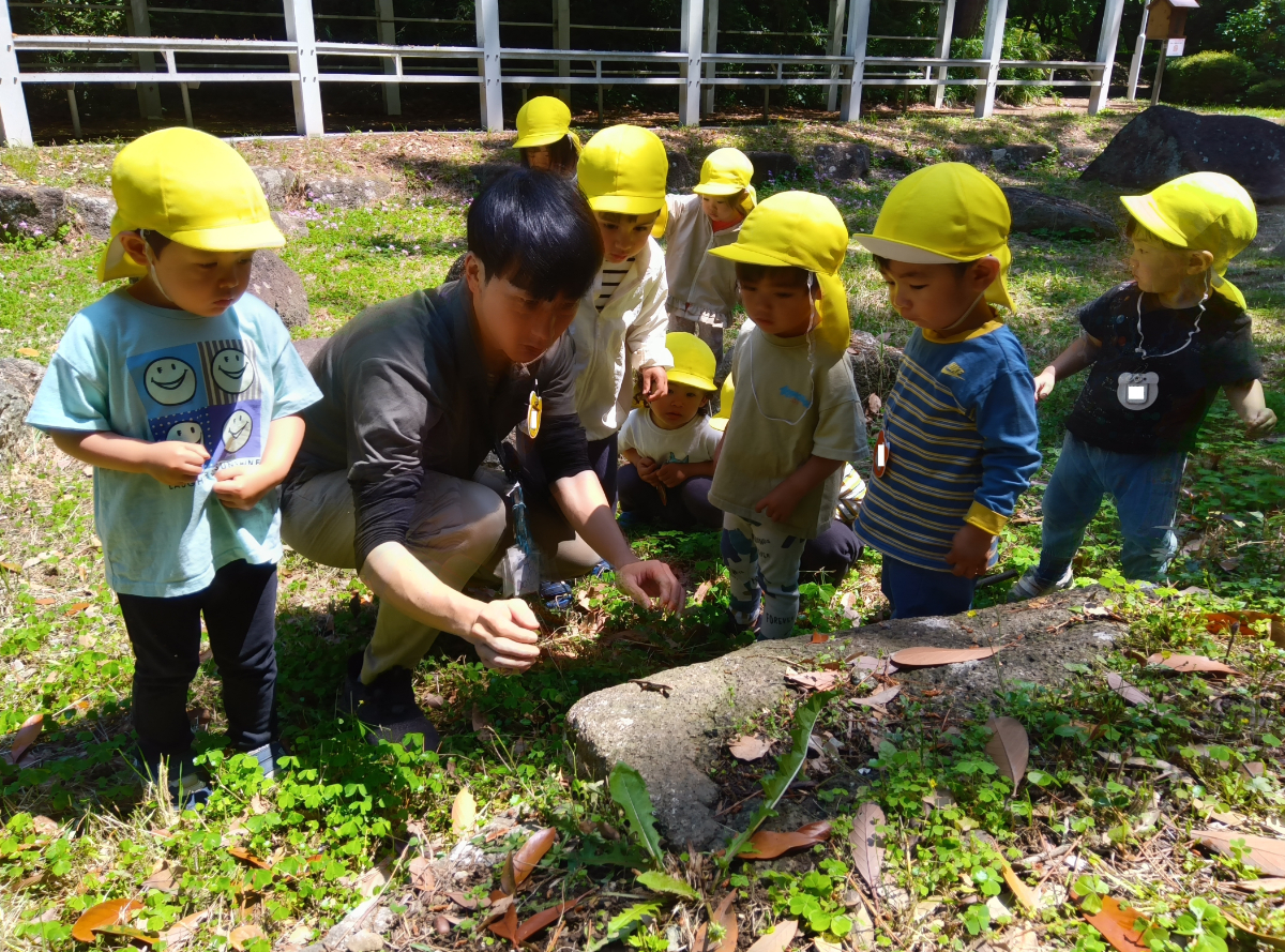 続いて、2~5歳児の探索活動です。アリやダンゴムシ、カタツムリやナメクジなどの生きものが活発になるこの季節、子どもたちは生きもの探しに夢中になっています。どうやらカナヘビを発見したようです。見慣れないカナヘビに少々怖気づいている子どもたち。ここは保育者の見せ所。保育者がカナヘビをそっと捕まえると、子どもたちは大喜びです。保育園に連れて帰り、みんなで大切に育てています。