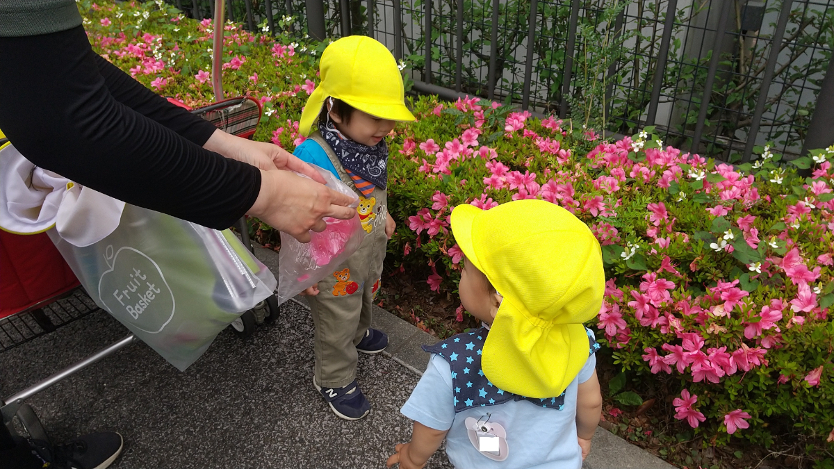 0~1歳児も、毎日元気に戸外活動を楽しんでいます。最近は、身近な自然に親しみを感じるようになってきた子どもたち。綺麗に咲いたツツジを指差し、「おはな!」と注目する子どもの姿がありました。散ってしまったお花を拾ったり、袋にたくさん集めたりしながら散歩を楽しんでいます。