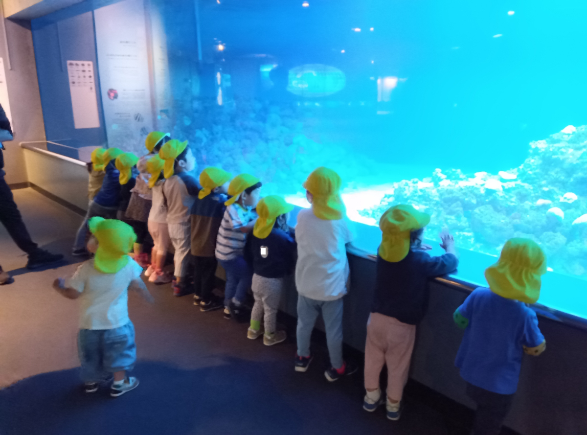 最後は遠足です。5月の遠足は、どろんこバスに乗って、葛西臨海水族園へ行ってきました。水族園のある葛西臨海公園までは、どろんこバスに揺られて30分。「なんのさかながいるかな?」「たのしみだね!」などと友達や保育者とおしゃべりしながら向かっていました。いざ水族園へ入館すると、キラキラとした水面や数々の海の生きものたちが出迎えてくれました。いろいろな海の生きものを見ることで、子どもたちは新しい発見や自然への関心を高めることができたようです。