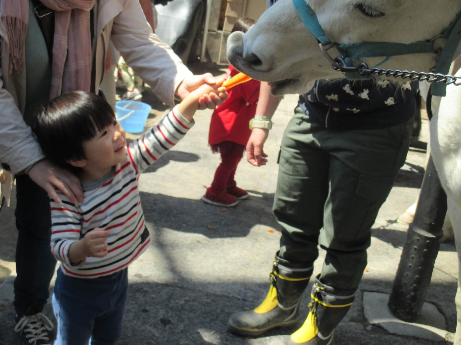 ポニーの大きいお口にドキドキしながらも口元まで人参を運ぶ子どもたち。食欲旺盛なポニーたちはどんどん人参を食べ、「たべた!」と嬉しそうな声が沢山聞こえてきました。