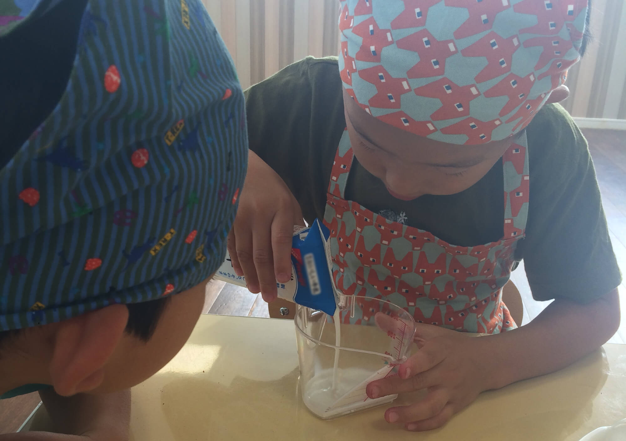 初めて収穫したさつまいもをスイートポテトにしました。手順を聞いてから、まず牛乳を軽量カップで測ります。手先をコントロールしてメモリまで上手に入れられるでしょうか。レンジで柔らかくしたさつまいもを、いろんな道具の中から自分でどれが良いかを考えて使ってみます。道具を選択し、実際に使って体験することで、道具の操作や力加減が判ってきますね。