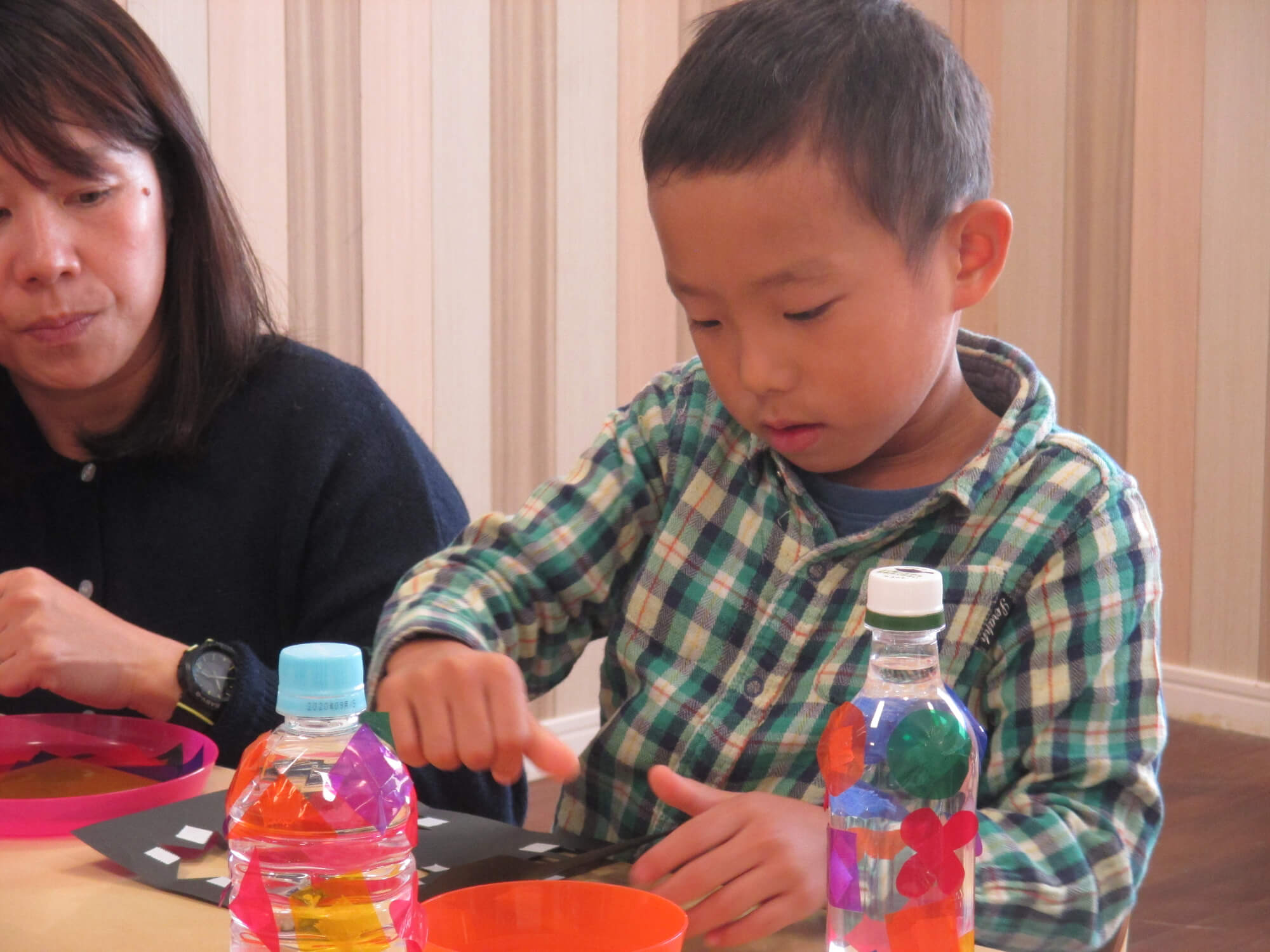 発達支援つむぎ阿佐ヶ谷ルームの11月の体験学習は、「光であそぼう」でした。今回は水を入れたペットボトルにいろんな形のセロファンを張り付けます。両面テープを剥がしてペットボトルに貼りますが、指先を上手に使いセロファンが破れないように、そっと剥がすことが出来ました。いろんな色を使う子もいれば、2色だけ使うなど、自分だけのオリジナリティ溢れるライトが出来ました。