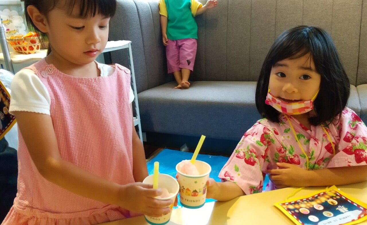 おみせやさんの制作コーナーでは、水あめづくりとかき氷づくりをしました。かき氷のブースでは好きな味のシロップをかけてストローをさしてみんなでかんぱーい!