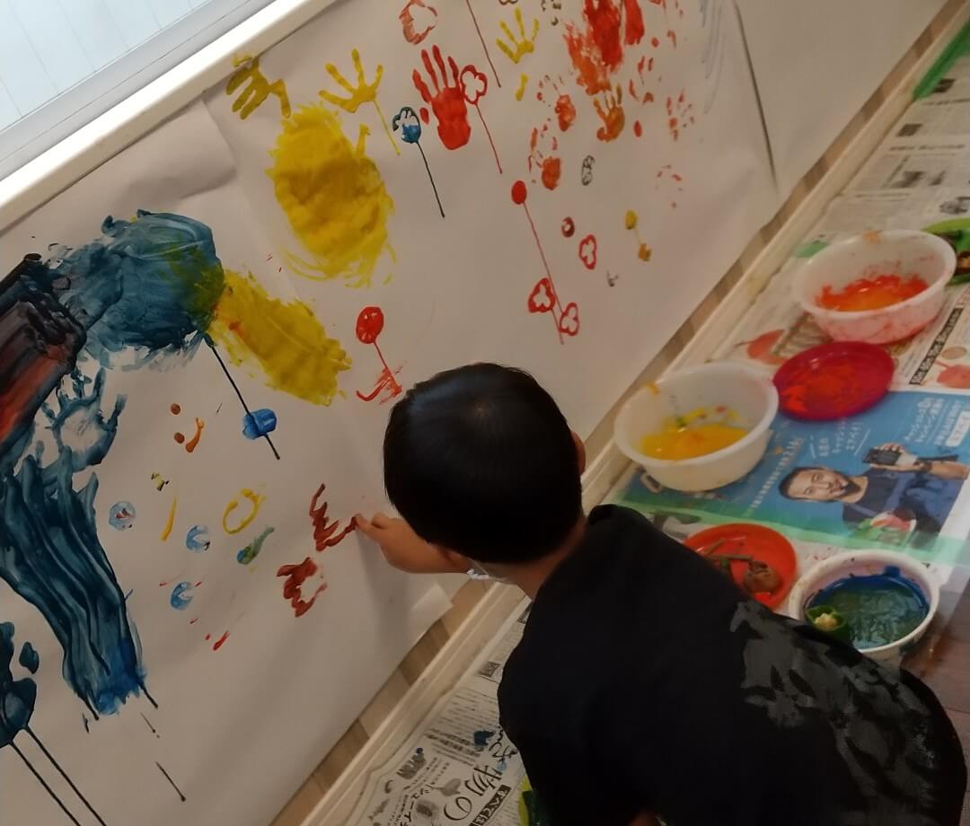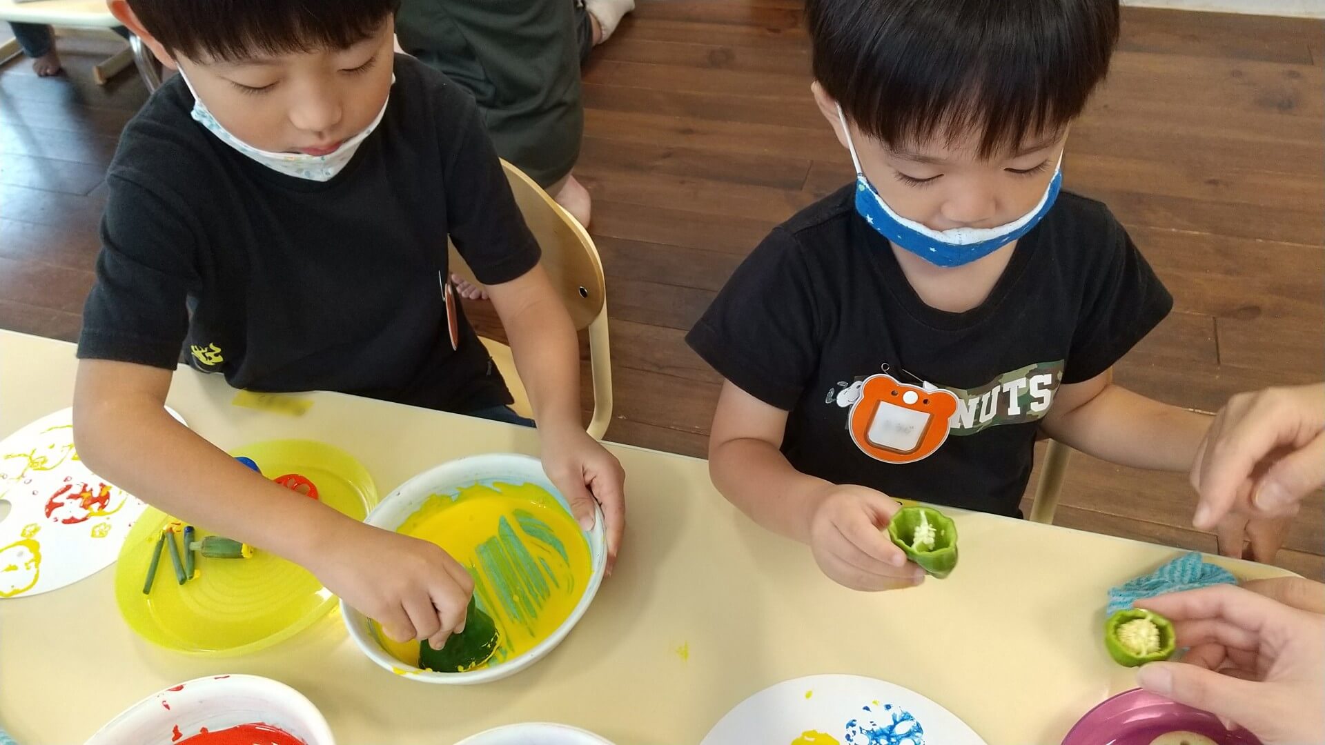 うちわ作りの後には、模造紙にも野菜スタンプを押しました。野菜スタンプだけではなく、手や足を使ってダイナミックに自由に表現をしている姿を見て、大人の想像を超えた素敵な作品がたくさんできました。