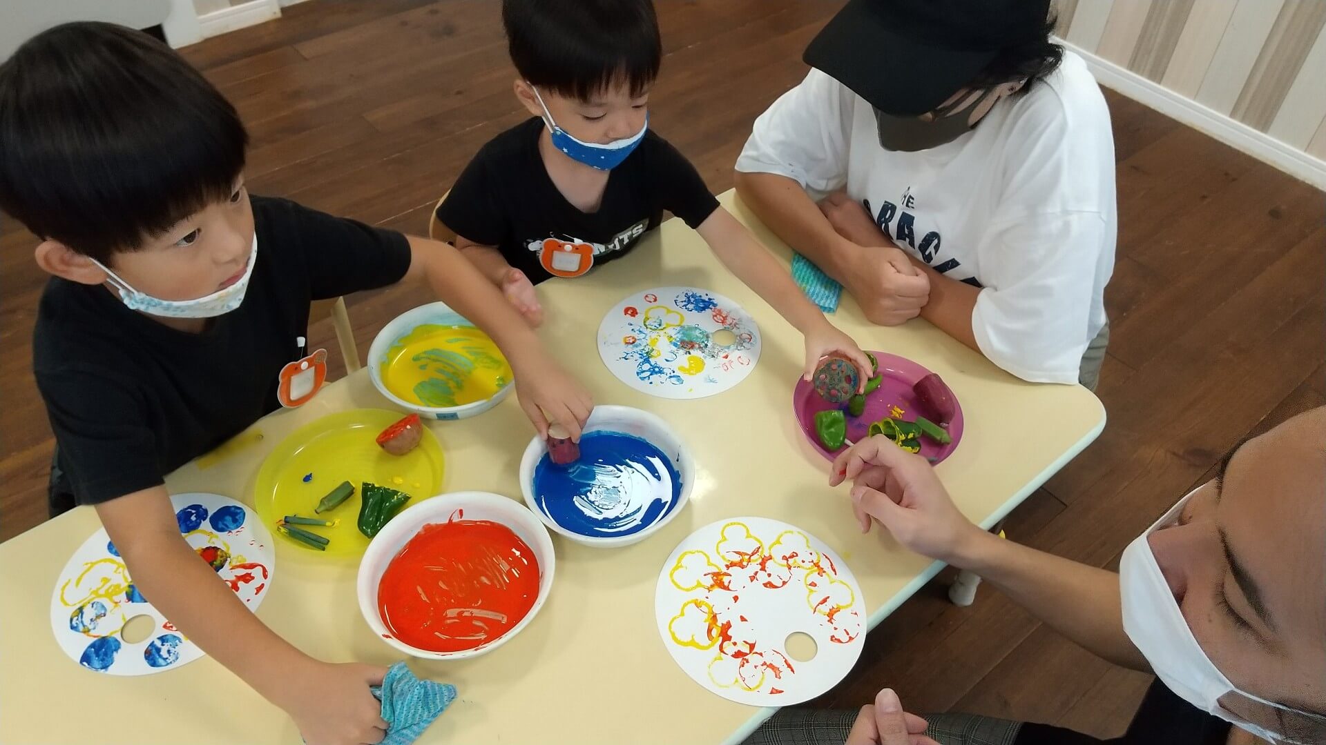 発達支援つむぎ阿佐ヶ谷ルームの9月の体験学習は、畑で野菜を植える予定でしたが、雨天のため室内での活動に変更し、「野菜スタンプを使ったうちわづくり」を実施しました。体験を通して食への興味や意識が芽生えました。また、阿佐ヶ谷ルームに畑を貸して下さっているシェアハウスの方や地域の農園の方にも一緒に参加していただき、交流ができました。