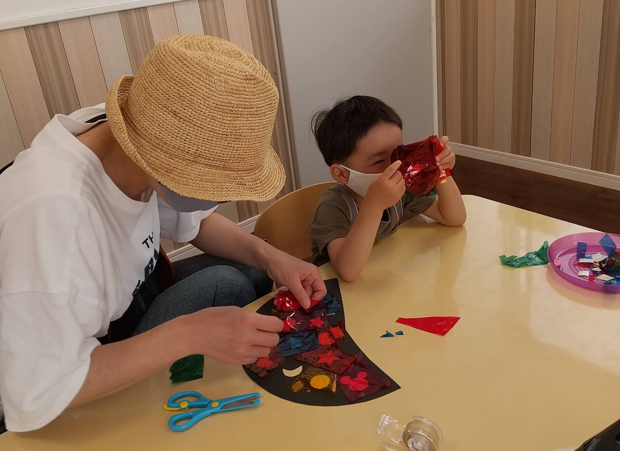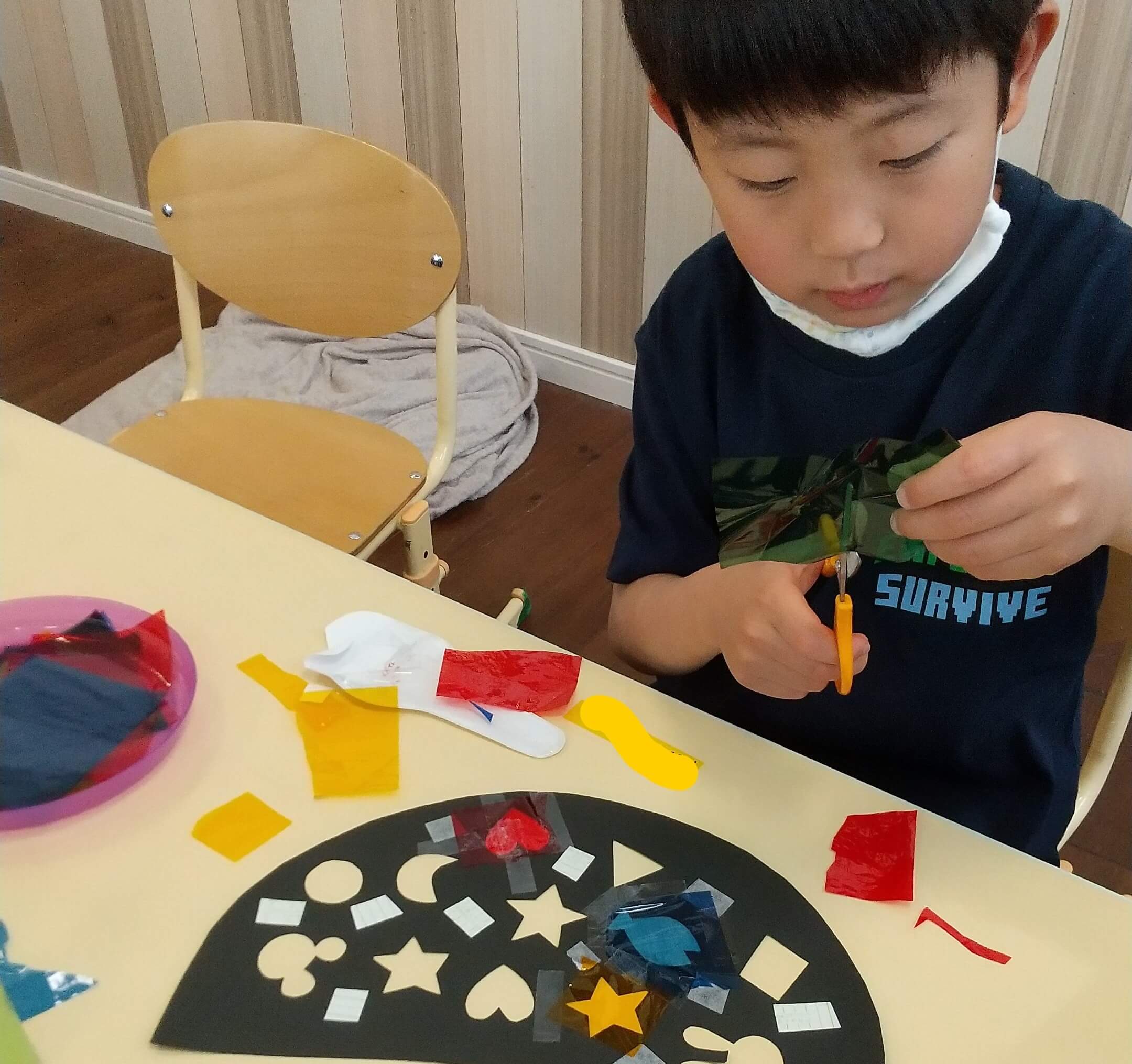 カラーセロハンは紙より切りづらさはありますが、保護者の方と協力しながら切ったり、「ここは何色にする?」と相談したりしながら作っている子や「重ねてみたらどうなるかな?」と、配色や位置を楽しみながら作る子もいました。