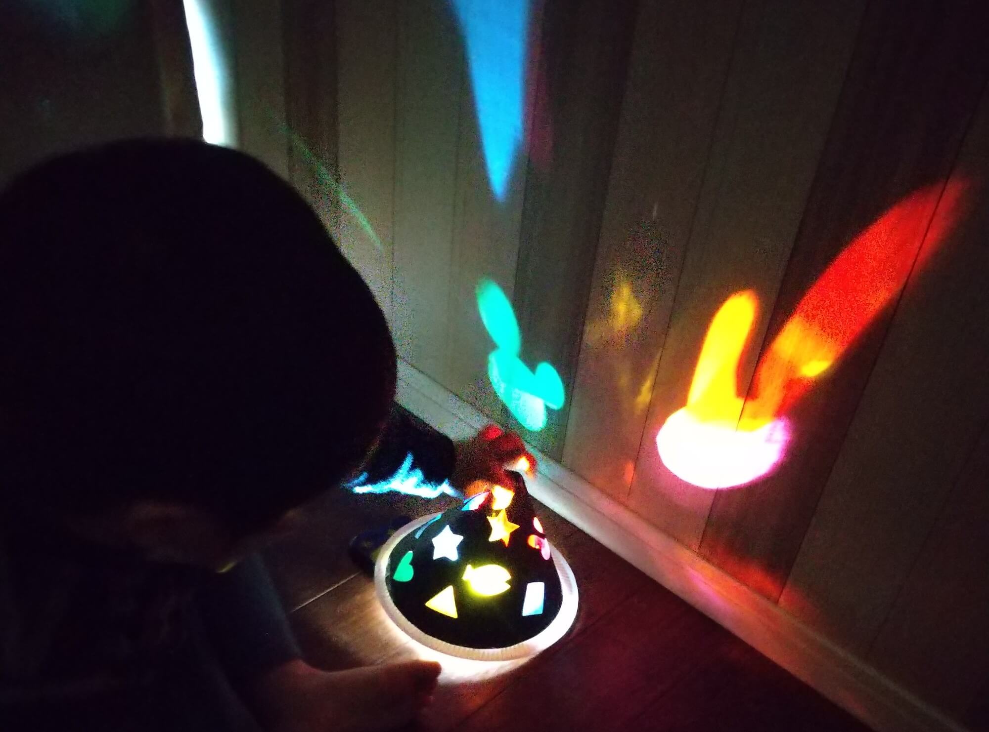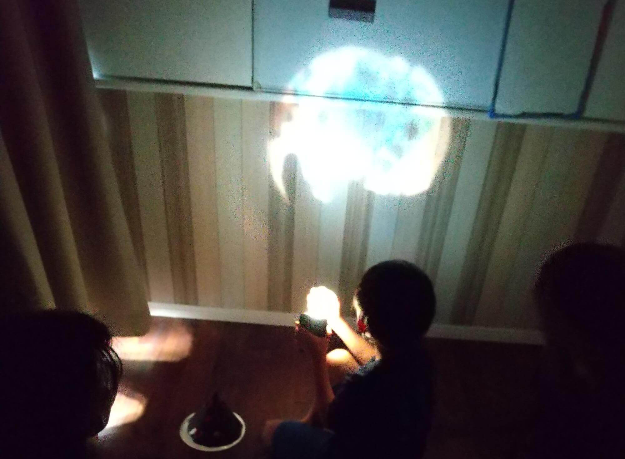 出来上がったプラネタリウムを光らせると、「きれいだね」「上にも写っているよ」など作ったプラネタリウムが光ることで驚きや感動を言葉にする姿が見られました。くるくる回すことで様々な形が浮き上がって、子どもも大人も楽しみながら鑑賞することができました。