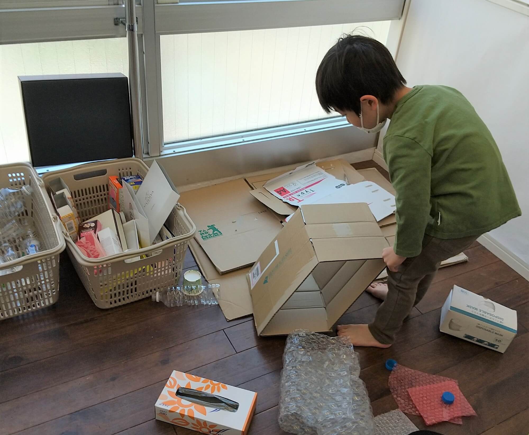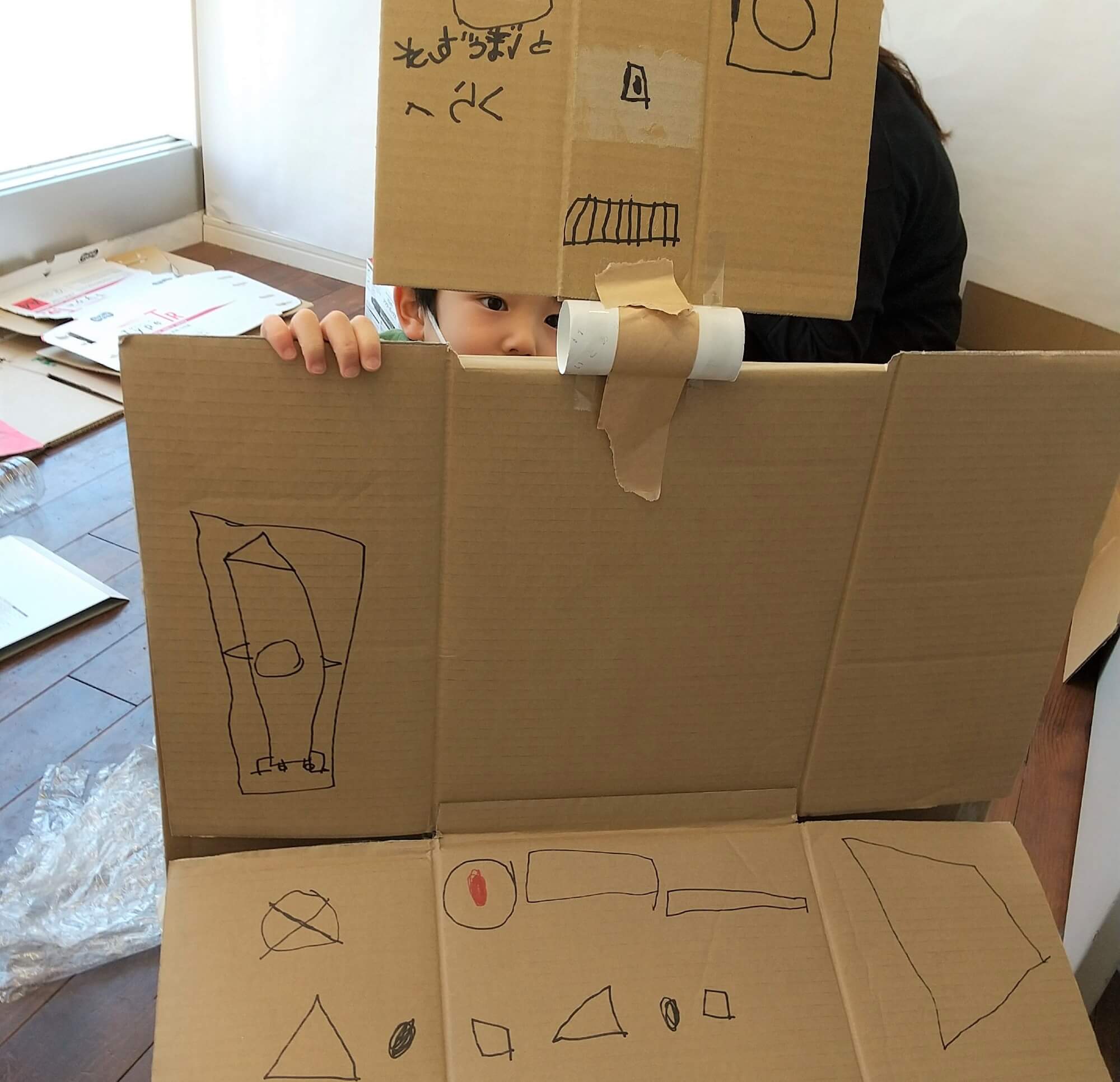 こちらは段ボールやトイレットペーパーの芯を使ってロボットを作っている子どもの様子です。ペンで顔や模様を描いて完成させていました。世界に一体だけのロボットが誕生!