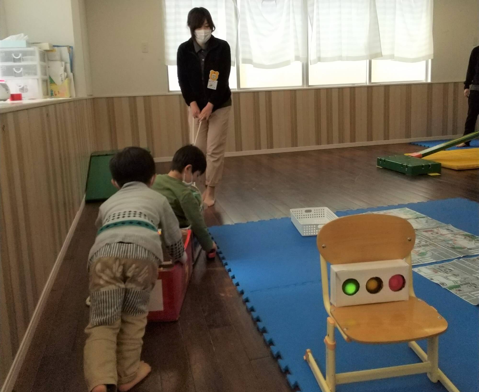 プレイルームでは、段ボールのトーマスに一緒に乗って機関車ごっこを楽しむ子どもたちの様子が見られました。「ここに信号を置いてみたら?」と子どもたち同士で相談しながら遊びを考えていました。