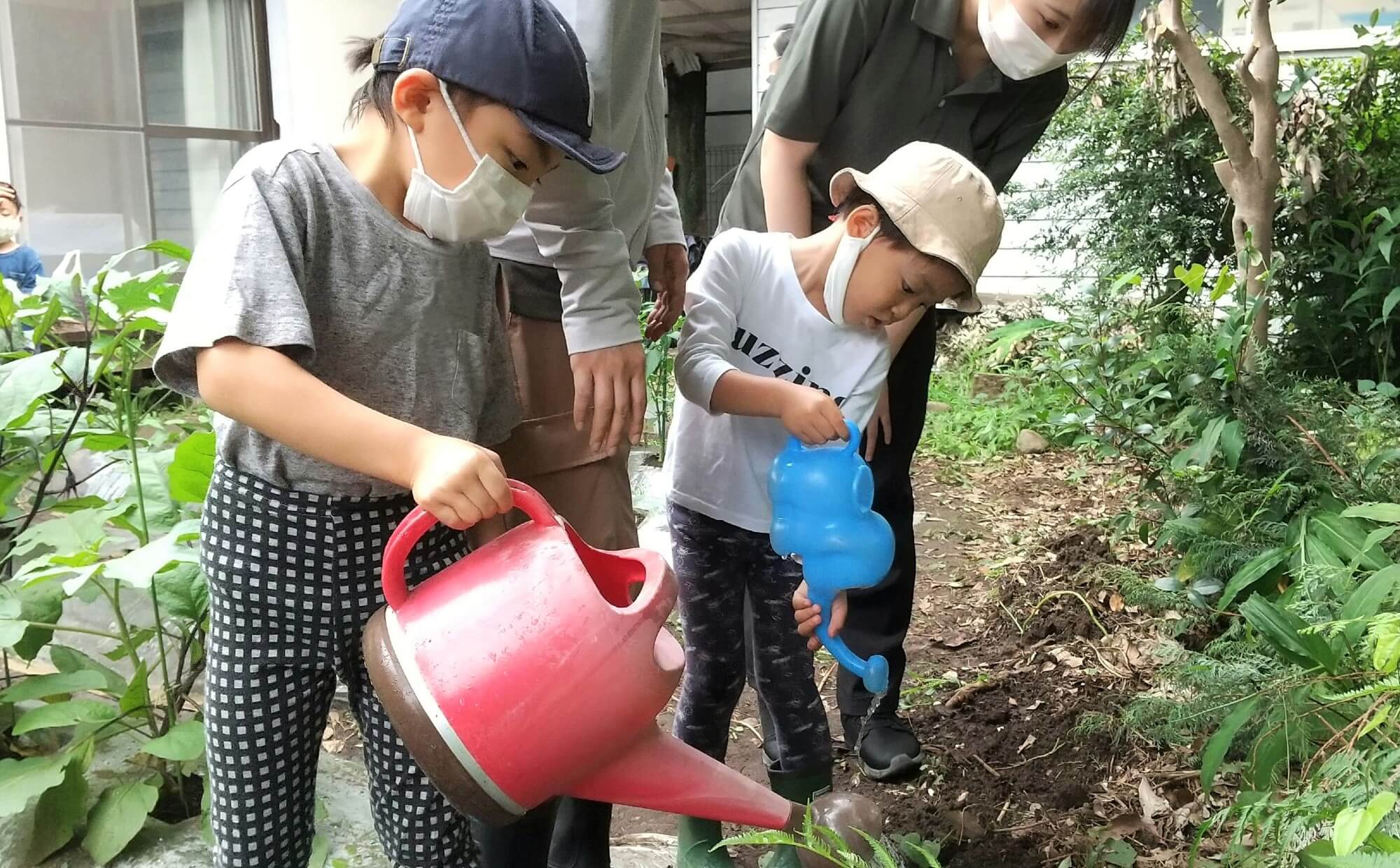 まずはひまわりの種を植え、水やりをしました。土に指で穴をあけ、一つの穴に2つずつ種を数えながら入れ、ふんわりと土をかぶせてあげました。そして植えたところにじょうろでお水をやりました。雨続きで足元がぬかるむ中、転ばないようにじょうろを運んだり、土の感触を楽しんだり、力の加減を調節したり、五感をフルに使って畑仕事をしている様子が見られました。