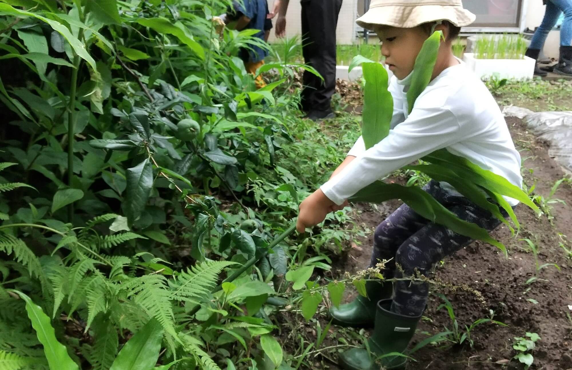 野菜の収穫ではトマトやピーマンにオクラ、畝の周りに生えているみょうがを引き抜きました。一般的に食べられているみょうがの部分は、「みょうがの子」や「花みょうが」と呼ばれ、花穂(かすい)という名前が付いています。花穂が大きく育っているものを見つけるため、みんな全身に力を入れて何本も抜いていました!まだ緑のトマトを見て「緑のトマトがあるよ」と皆に教えてくれる子や、野菜そっちのけで虫を探して見せてくれる子もいて、思い思いに畑の時間を楽しみました。