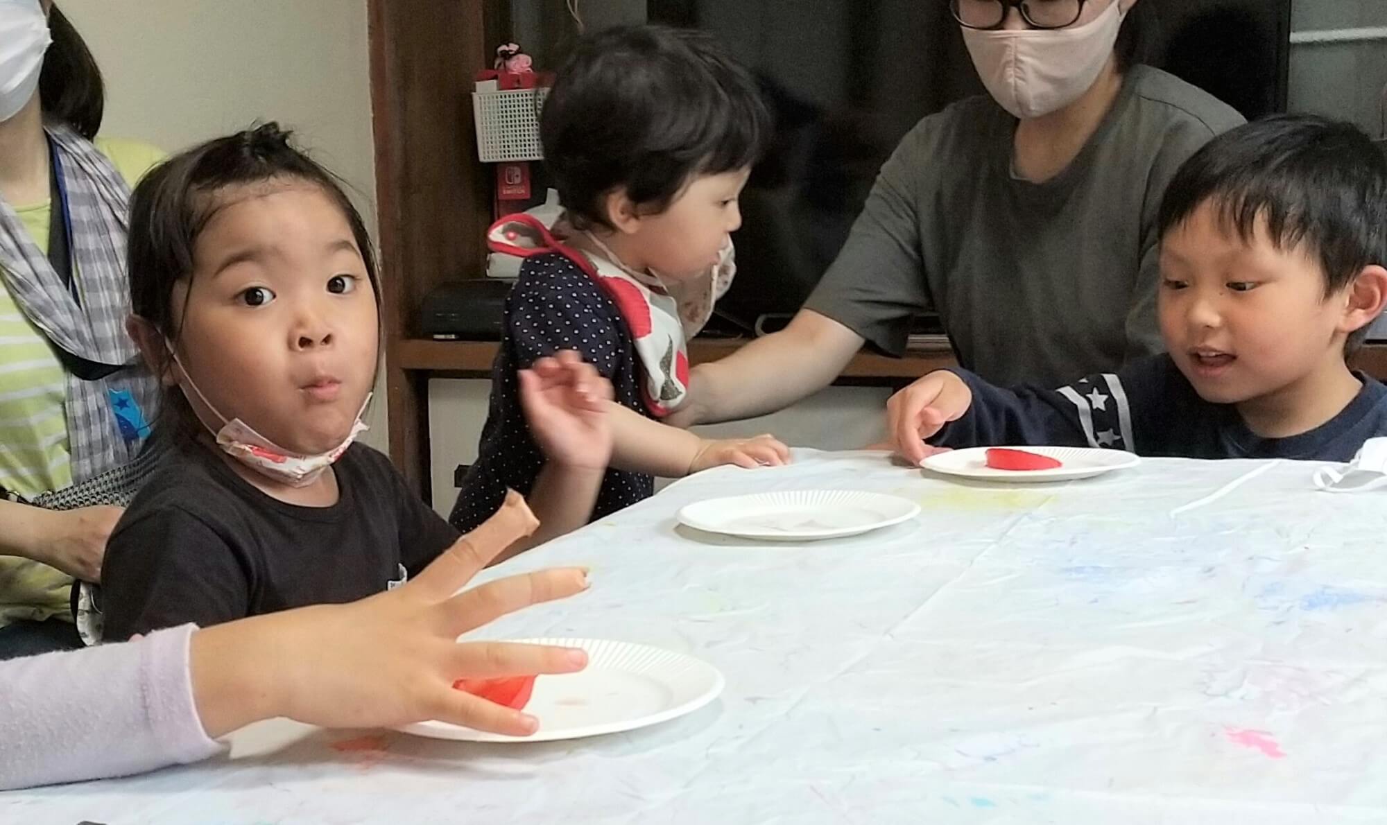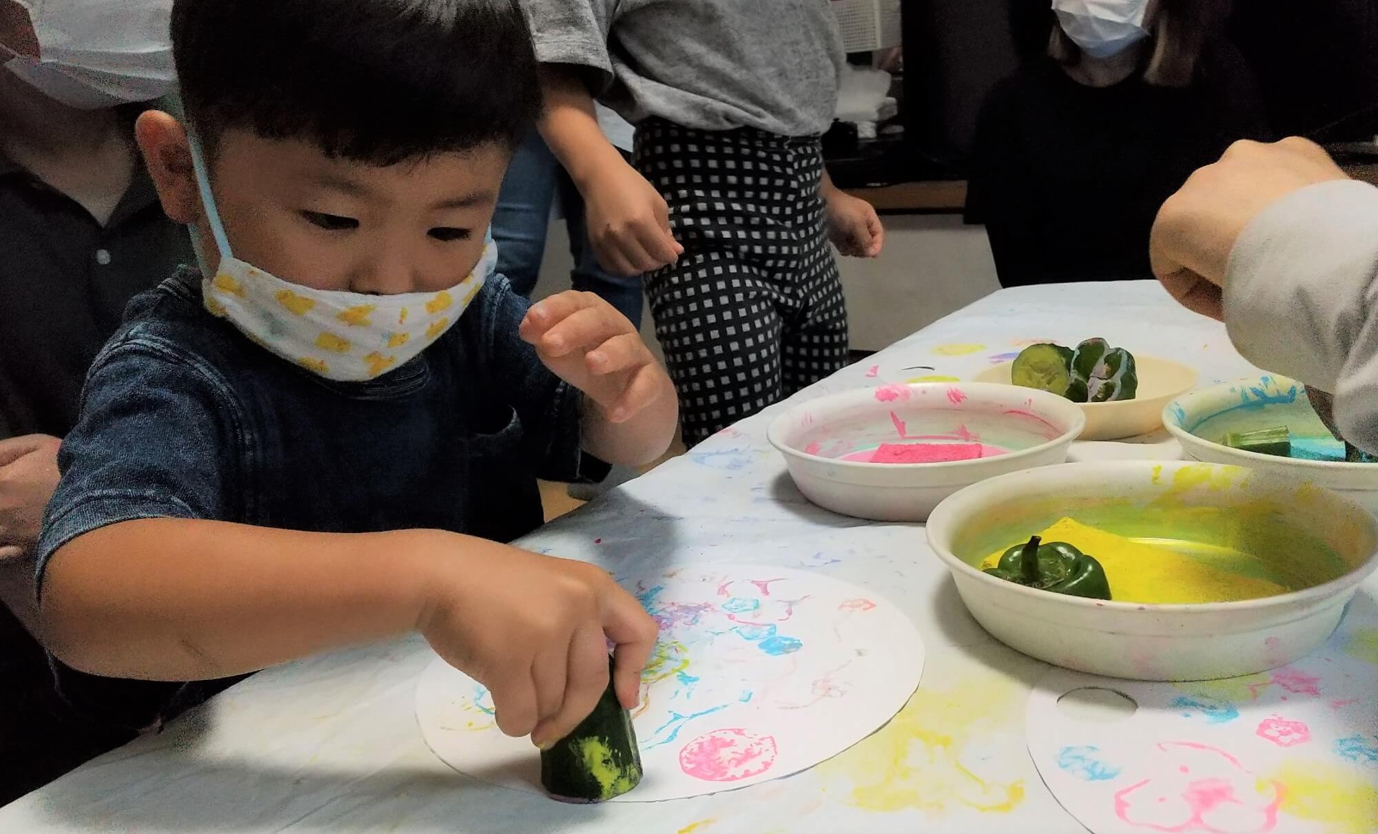 たくさん身体を動かした後は、収穫した野菜を持って室内で野菜スタンプをしました。野菜のヘタを見て、何の野菜かのクイズをした後、実際に野菜でスタンプを押しました。オクラのスタンプを見て「わー、お星さまだ!」という子を見て「僕もそれやりたい!」と、初めて会う子ども同士にも関りが見られたり、ピーマンのスタンプは蝶々みたいだねと大人に言われ嬉しそうにたくさん押したりする子もいました。