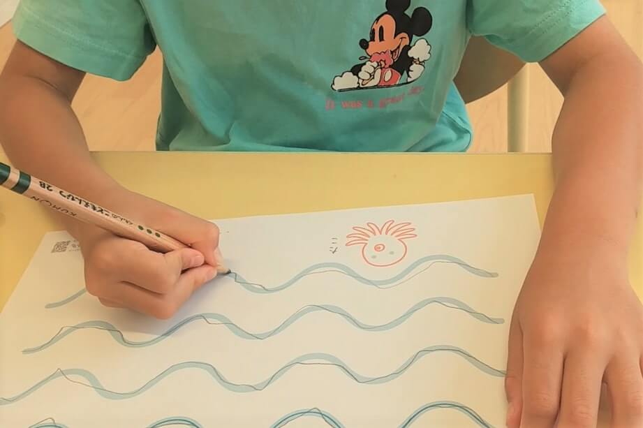 4本の指で鉛筆を支えていたことと、間違った支点で鉛筆を持っていたことから指先に力が入りやすく、鉛筆をスムーズに動かせませんでした。その為に線も安定しない様子が写真からうかがえます。