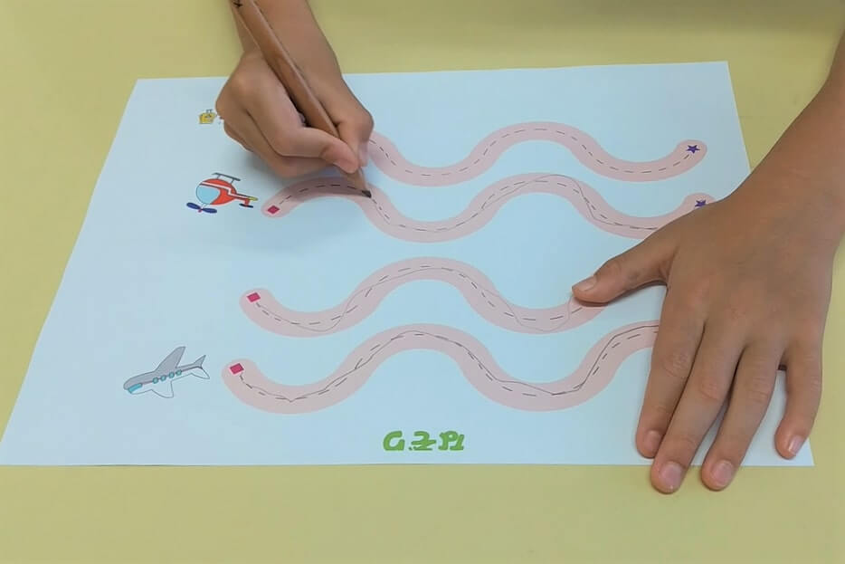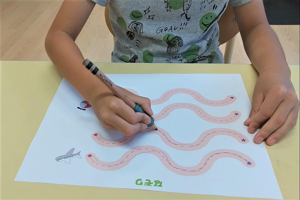 今回の指導内容紹介では線をなぞる課題をメインで行いましたが、迷路をなぞることや塗り絵をすることも文字を書く前の練習として効果的です。