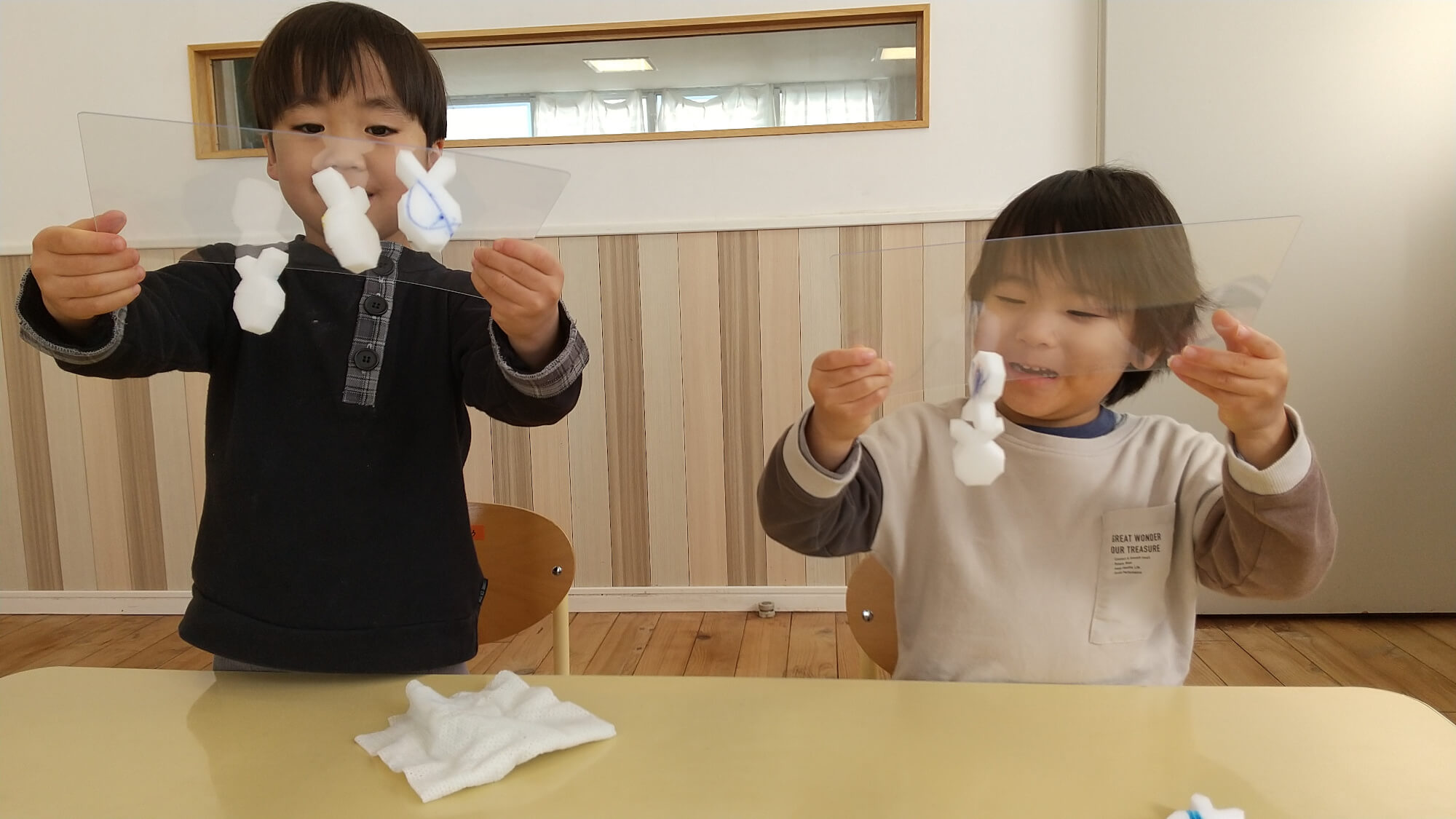 この他にも、ビニール紐を細かく裂いて下敷きの静電気で浮かせる「電気クラゲ実験」や、片栗粉と水を混ぜることで様々な感触を楽しめる「ダイラタンシーの実験」を行いました。電気クラゲ実験は湿度の影響で上手くいきませんでしたが、「もっと割いたらうまくいくかな」「下敷きを脇に挟んで静電気起こしてみよう」と自分で考えて行動する姿が見られました。
