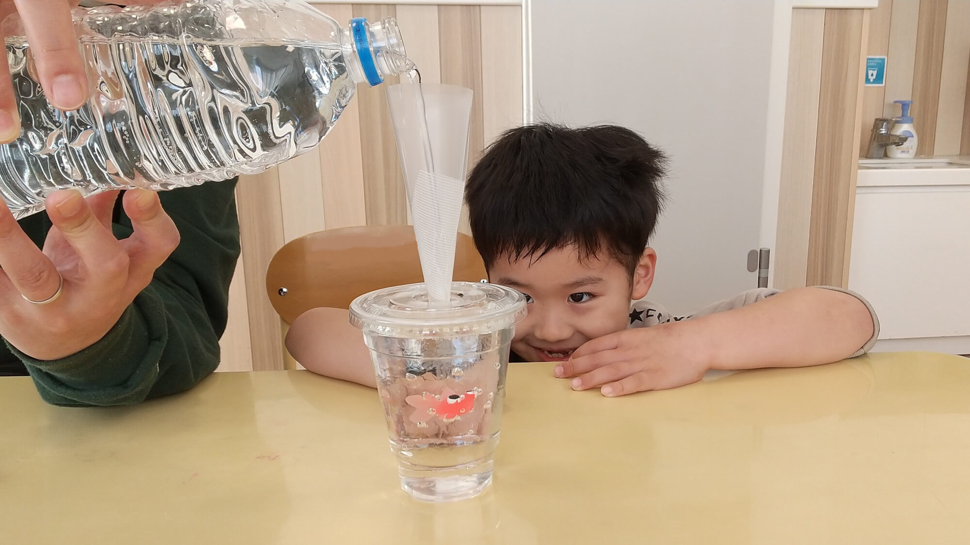 透明な消臭ビーズが入ったコップに水を注ぐと、先程までは見えていなかった金魚の玩具が見えてきました。「不思議!」「浮いているみたい」と大盛り上がりでした。