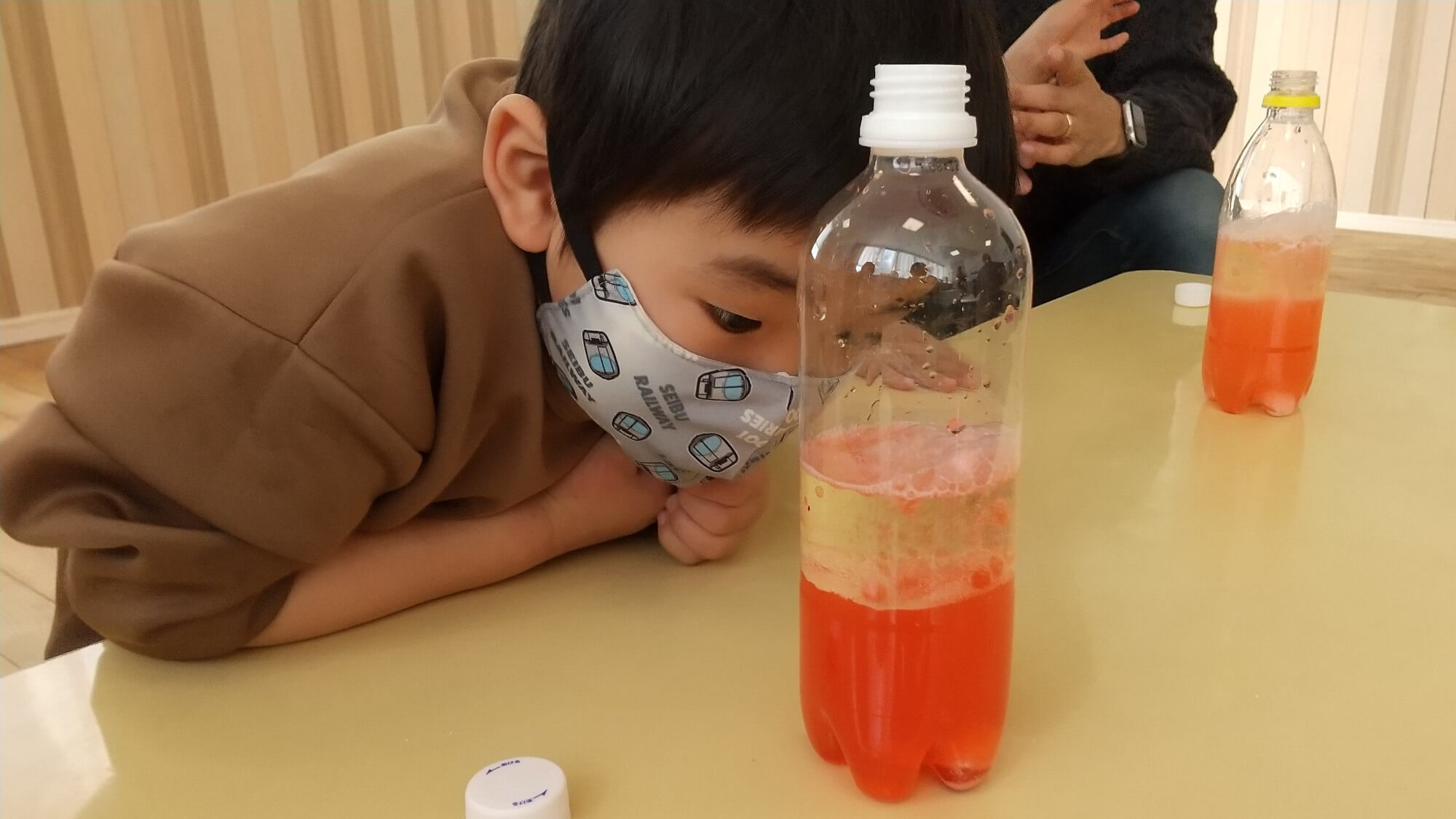 水と油が入ったペットボトルに発砲入浴剤を入れると、マグマのように泡がぶくぶく湧き出してきます。どんどん吹き上がる様子を、顔を近づけて観察していました。