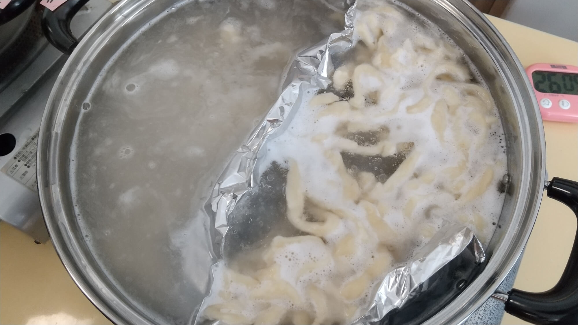 保護者と一緒に子どもたちがイメージするうどんの太さに切りましたが、鍋で湯がくと思っていた太さでなかったり、真っすぐなうどんでなかったり、予想とは異なる出来上がりになっていました。うどん屋さんで出される真っ直ぐで食べやすいうどんを作ることが、どれだけ難しく、工夫されているものであったか身をもって分かった良い経験となりました。