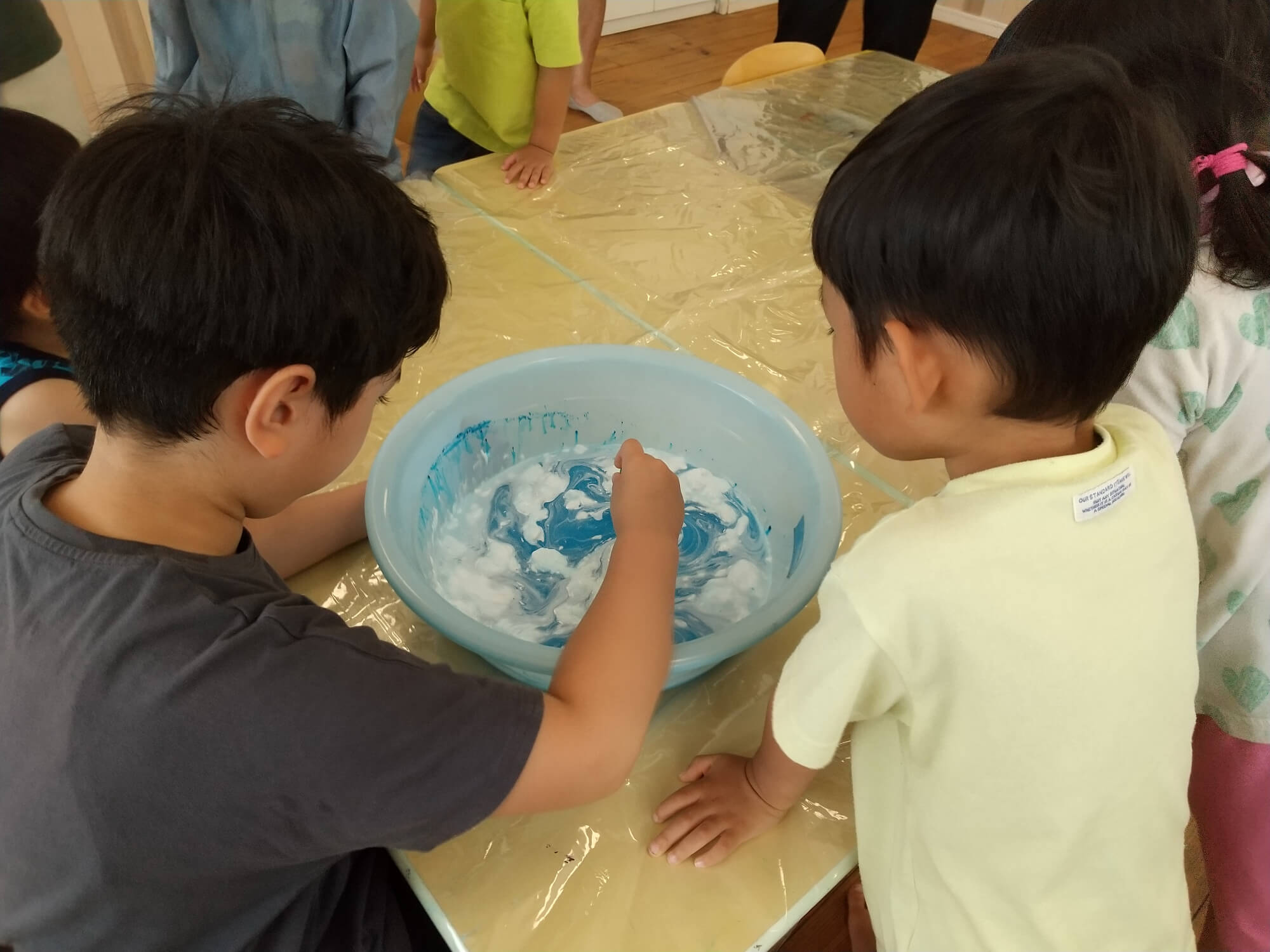 初めに水を入れる役、糊を入れる役、かき混ぜる役を決め、水と糊を入れていきました。軽く混ぜたら、食用色素とシェービングフォームを子どもたちに加えてもらい、更に混ぜていきます。最後にホウ砂水を入れ、全員で力を合わせて大きなスライムを作っていきました。