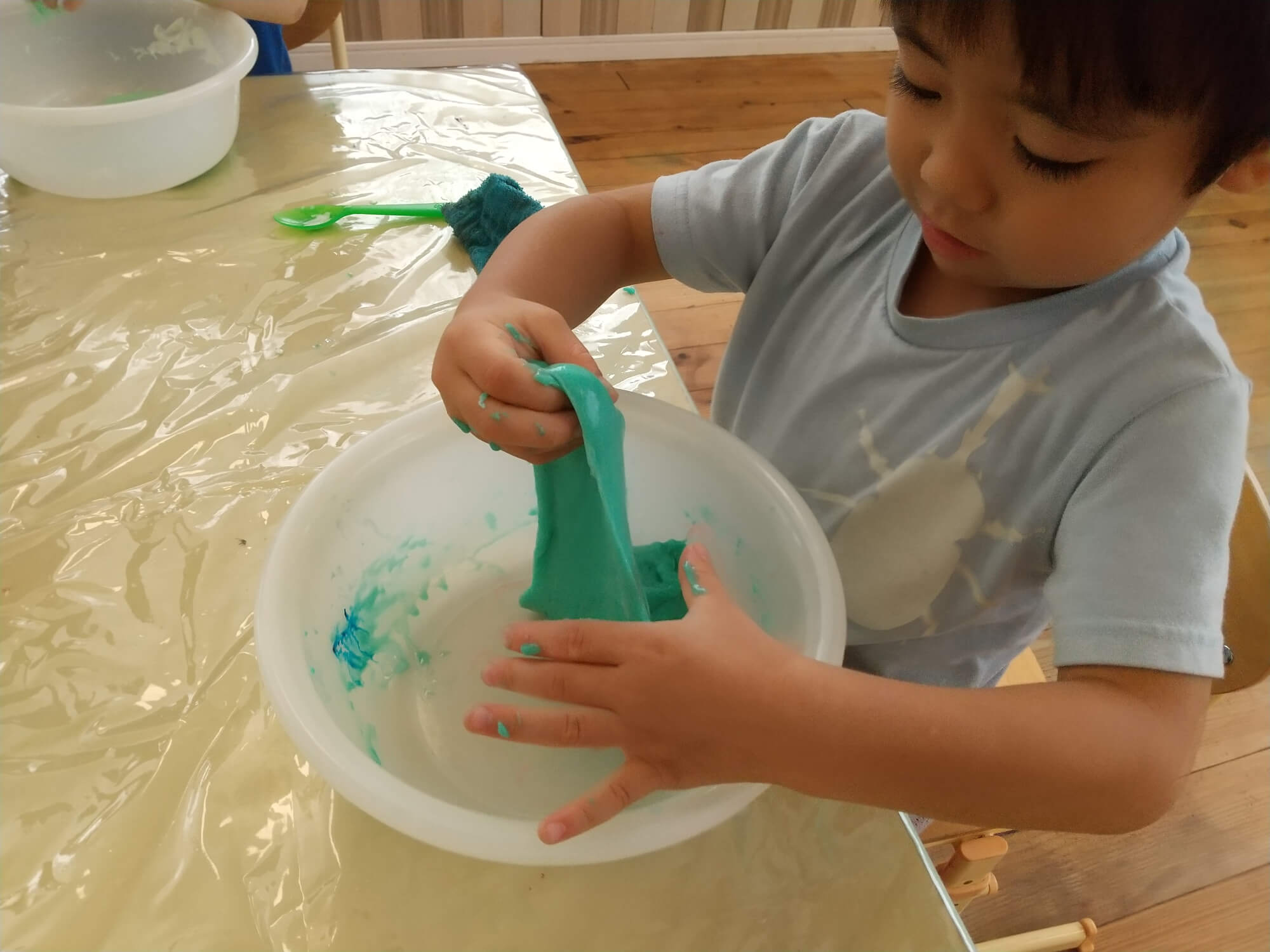 スライム作りは、触覚と固有受容覚を存分に使う遊びです。皮膚から得た情報を処理する経験を重ねることで物を見なくても触れている物が何か分かるようになったり、物(他者)と自分の距離感を身に着けられたり、力加減の調節ができるようになったり、冷たさや硬さ、厚みなどの違いに気付くことができます。また、力を思い切り入れることは発散にも繋がります。作り方も簡単ですので、夏休みや冬休みなど自宅で過ごす時間が多い日にはぜひご家庭でも作って頂ければと思います。