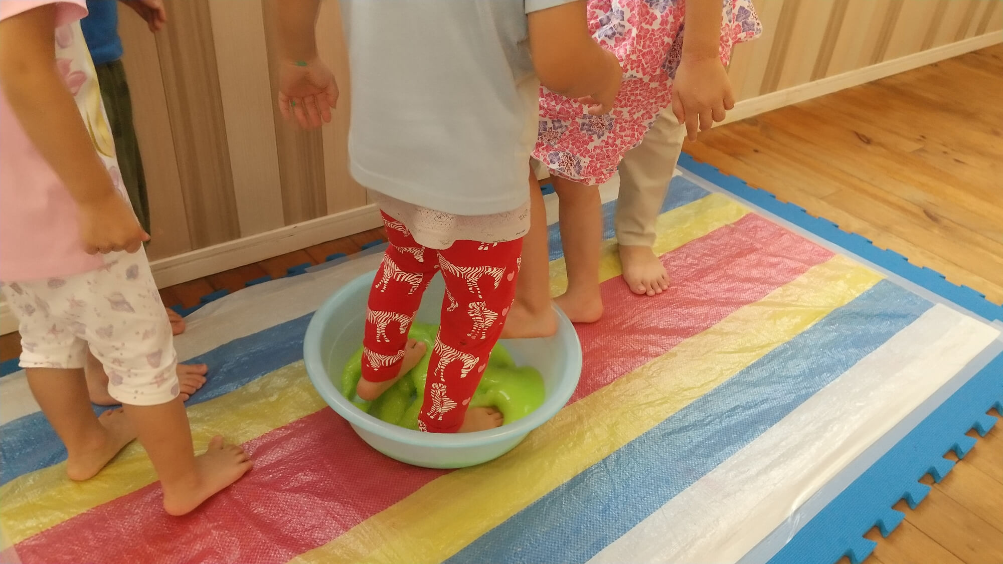 最後は桶の中に足を突っ込み、ひんやりと感じたり、友だちのスライムを少し貰って自分のスライムと混ぜ合わせたり、キャラクターを作ってみたりと自分のしたいことを思い思いに行って過ごすことができました。