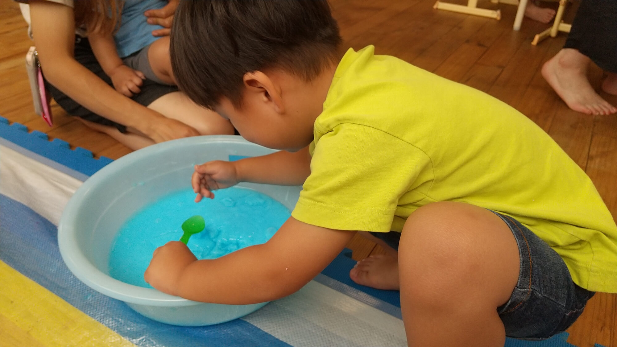 普段の活動でも行っている「感触遊び」ですが、今回は大きな桶の中でスライムを作る体験をしました。