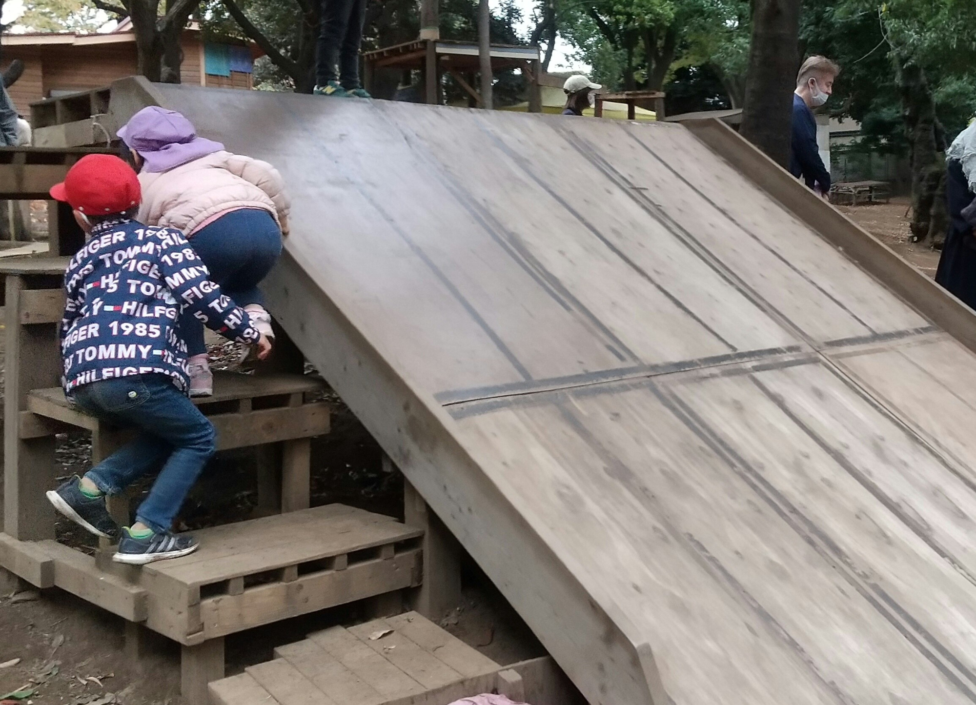 さつまいもを火の近くに置いた後は自由にプレーパークで遊びました。滑り台の階段を上る際には順番に上がり、友だち同士で一緒に滑ろうとする様子が見られていました。