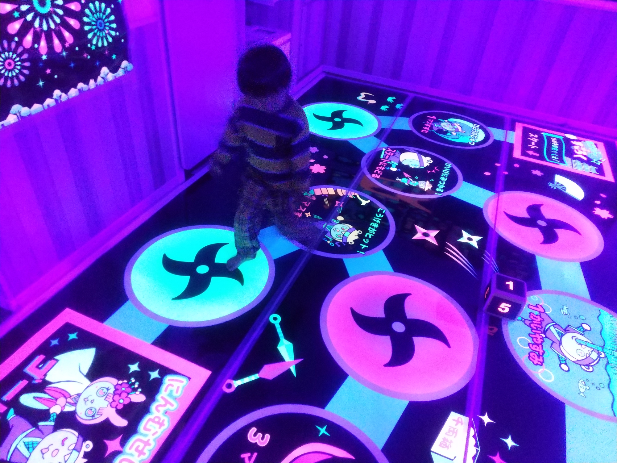 床には光るすごろくがあり、子どもたち同士で「すごろくやるひとー!」「はーい!」とやりとりをしながら遊ぶ様子が見られました。