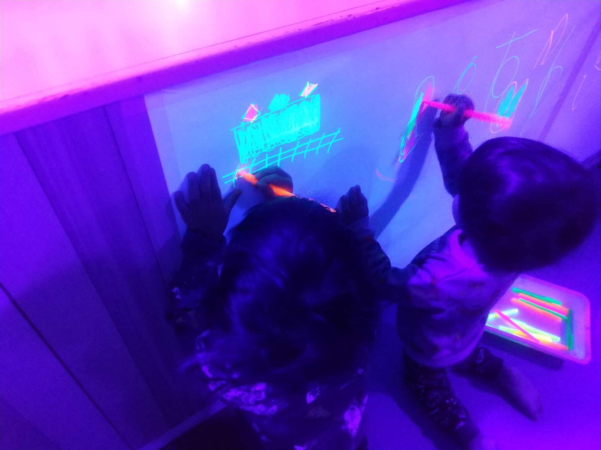 ブラックライトルームでは蛍光ペンがよく光って見えるため、壁に貼ってある模造紙や自分の身体に蛍光ペンで色を塗り、光る様子を楽しんでいました。