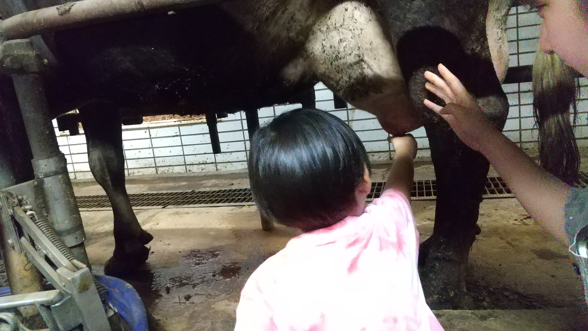 そして、待ちに待った乳しぼりです。お父さんやお母さんの指を借りて乳しぼりの練習をしたら本番です。乳しぼりをする前に「今から絞るよ」と牛の体を触ってあげます。先ほど練習したように乳房を優しく握ると、牛乳が出てきました。子どもたちは「すごい温かかったよ」「たくさん出せたよ」と嬉しそうでした。