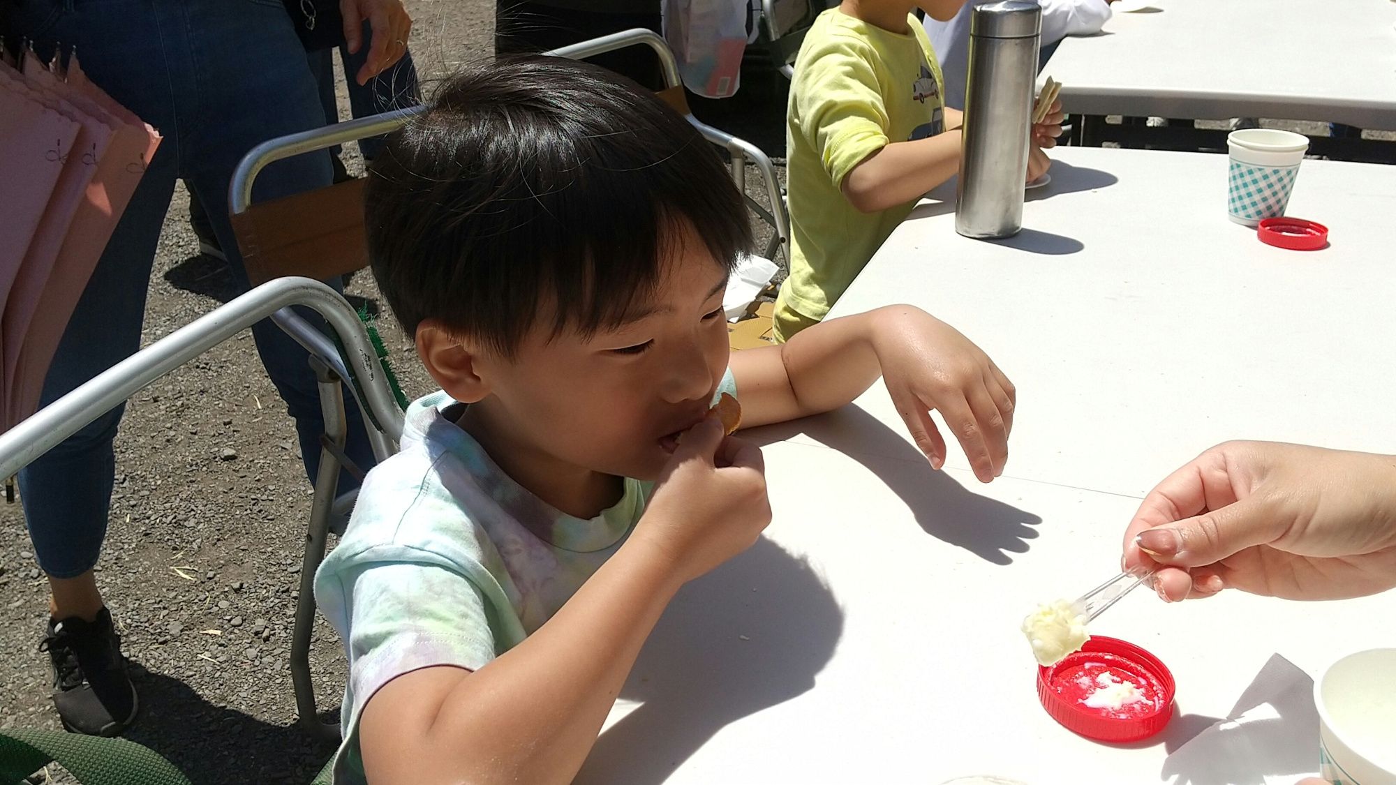最後はバターづくり体験です。生クリームが入ったカップを上下にたくさん振ります。子どもたちはシャカシャカという音が鳴らなくなるまで、一生懸命振り続けていました。作りたてのバターをクラッカーに乗せて食べるととても美味しくて、みんな集中して食べていました。