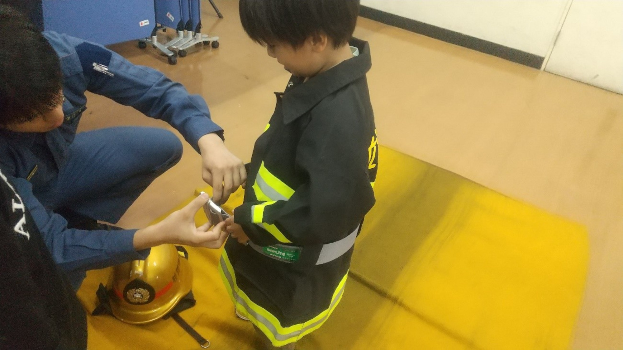 防火衣の着装体験では4種類の子ども用防火衣があり、それぞれ着たい防火衣のところに移動して着装しました。着るのが恥ずかしくてヘルメットのみ挑戦する子もいれば、何着も来ている子もいました。また、消防士の方に着せてもらう間、緊張した表情をしている子や写真を撮る際に敬礼ポーズをしたりしている子もいました。今回は黒い防火衣がかっこよくて大人気でした。